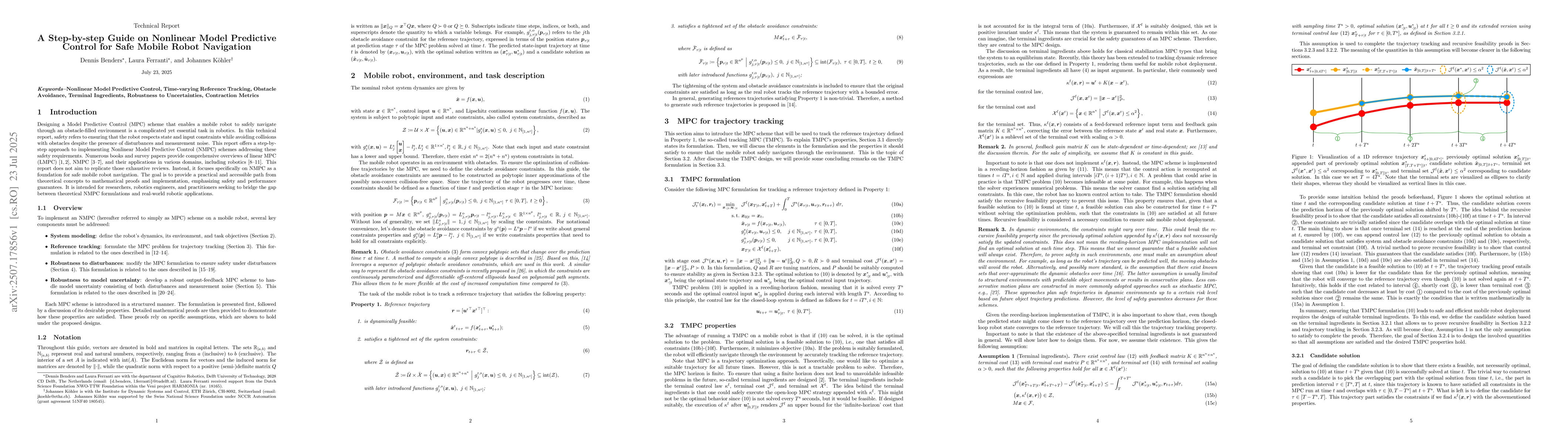 Designing a Model Predictive Control (MPC) scheme that enables a mobile robot to safely navigate through an obstacle-filled environment is a complicated yet essential task in robotics. In this technical report, safety refers to ensuring that the robot respects state and input constraints while avoiding collisions with obstacles despite the presence of disturbances and measurement noise. This report offers a step-by-step approach to implementing Nonlinear Model Predictive Control (NMPC) schemes addressing these safety requirements. Numerous books and survey papers provide comprehensive overviews of linear MPC (LMPC) \cite{bemporad2007robust,kouvaritakis2016model}, NMPC \cite{rawlings2017model,allgower2004nonlinear,mayne2014model,grune2017nonlinear,saltik2018outlook}, and their applications in various domains, including robotics \cite{nascimento2018nonholonomic,nguyen2021model,shi2021advanced,wei2022mpc}. This report does not aim to replicate those exhaustive reviews. Instead, it focuses specifically on NMPC as a foundation for safe mobile robot navigation. The goal is to provide a practical and accessible path from theoretical concepts to mathematical proofs and implementation, emphasizing safety and performance guarantees. It is intended for researchers, robotics engineers, and practitioners seeking to bridge the gap between theoretical NMPC formulations and real-world robotic applications. This report is not necessarily meant to remain fixed over time. If someone finds an error in the presented theory, please reach out via the given email addresses. We are happy to update the document if necessary.