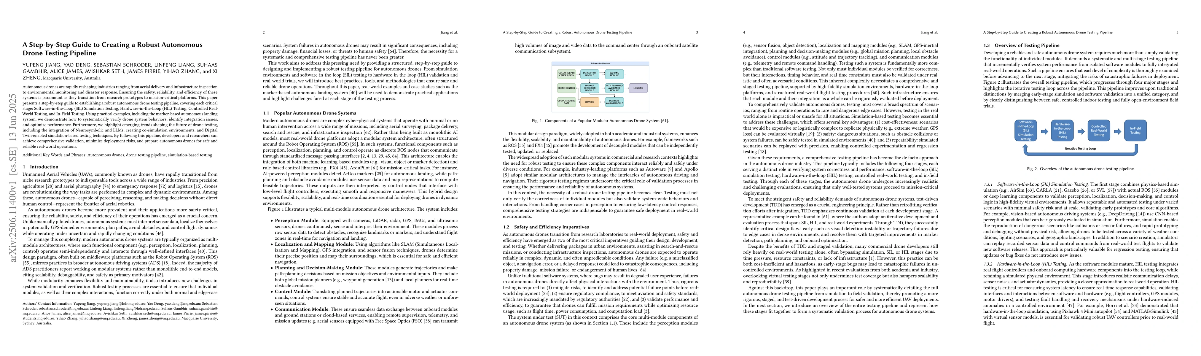 The paper presents a step-by-step guide for creating a robust autonomous drone testing pipeline, covering Software-in-the-Loop (SIL) Simulation Testing, Hardware-in-the-Loop (HIL) Testing, Controlled Real-World Testing, and In-Field Testing. It uses practical examples, such as a marker-based autonomous landing system, to demonstrate systematic verification of drone behaviors, integration issue identification, and performance optimization.