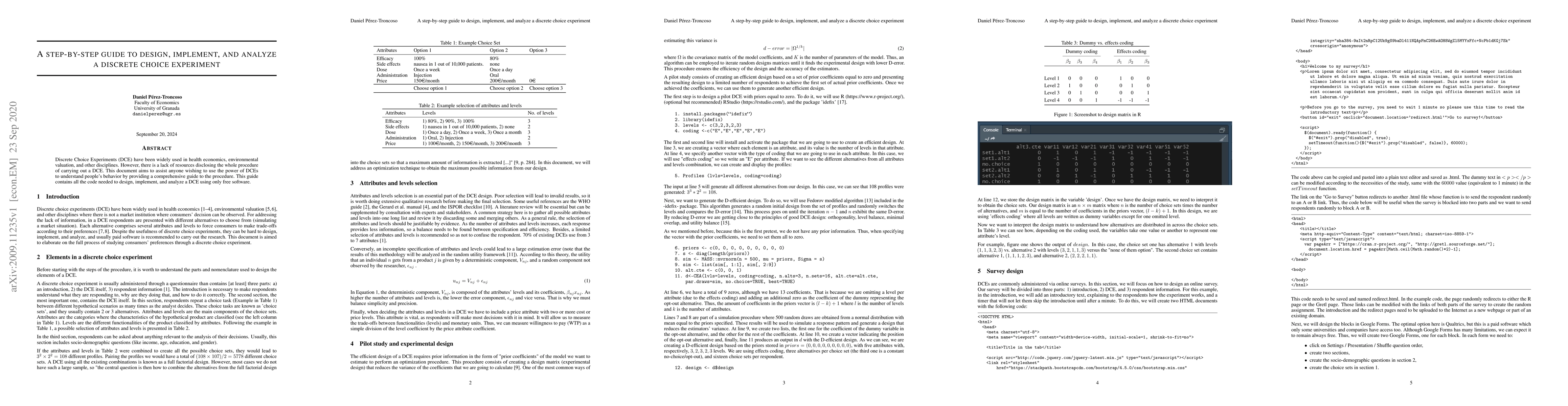 Discrete Choice Experiments (DCE) have been widely used in health economics, environmental valuation, and other disciplines. However, there is a lack of resources disclosing the whole procedure of carrying out a DCE. This document aims to assist anyone wishing to use the power of DCEs to understand people's behavior by providing a comprehensive guide to the procedure. This guide contains all the code needed to design, implement, and analyze a DCE using only free software.