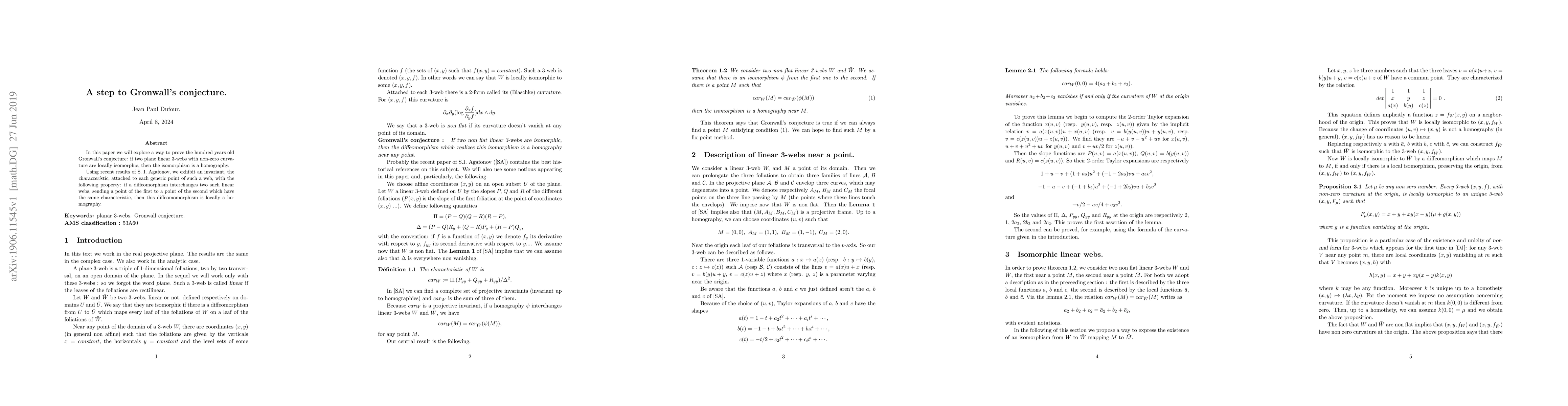 This paper proposes a method to prove Gronwall's century-old conjecture regarding the local isomorphism of plane linear 3-webs with non-zero curvature, showing that such isomorphisms are homographies. It introduces a new invariant, the "characteristic," to demonstrate that diffeomorphisms preserving this characteristic are locally homographic.