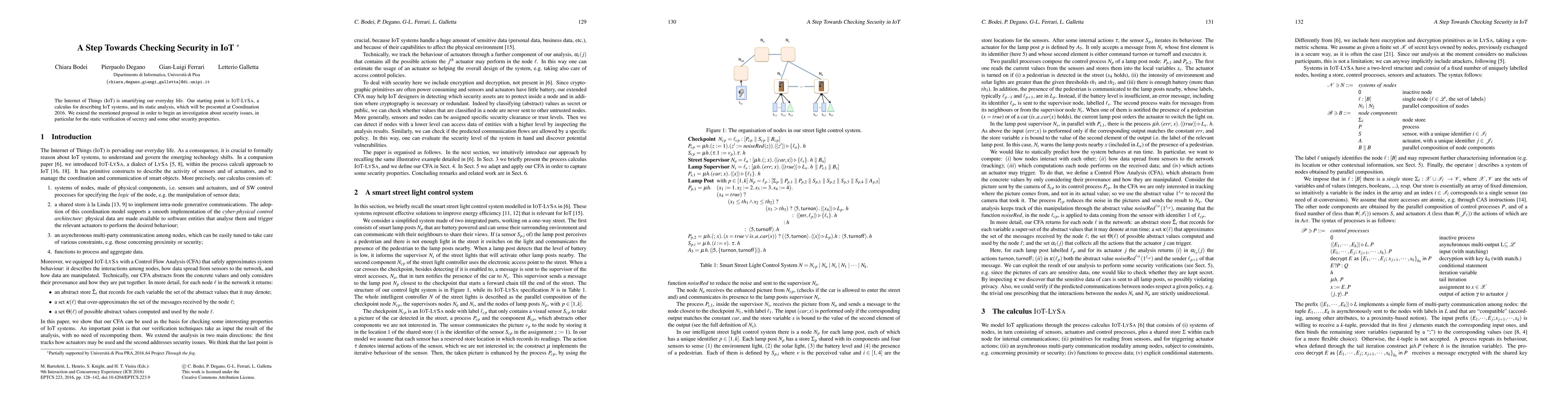 The Internet of Things (IoT) is smartifying our everyday life. Our starting point is IoT-LySa, a calculus for describing IoT systems, and its static analysis, which will be presented at Coordination 2016. We extend the mentioned proposal in order to begin an investigation about security issues, in particular for the static verification of secrecy and some other security properties.