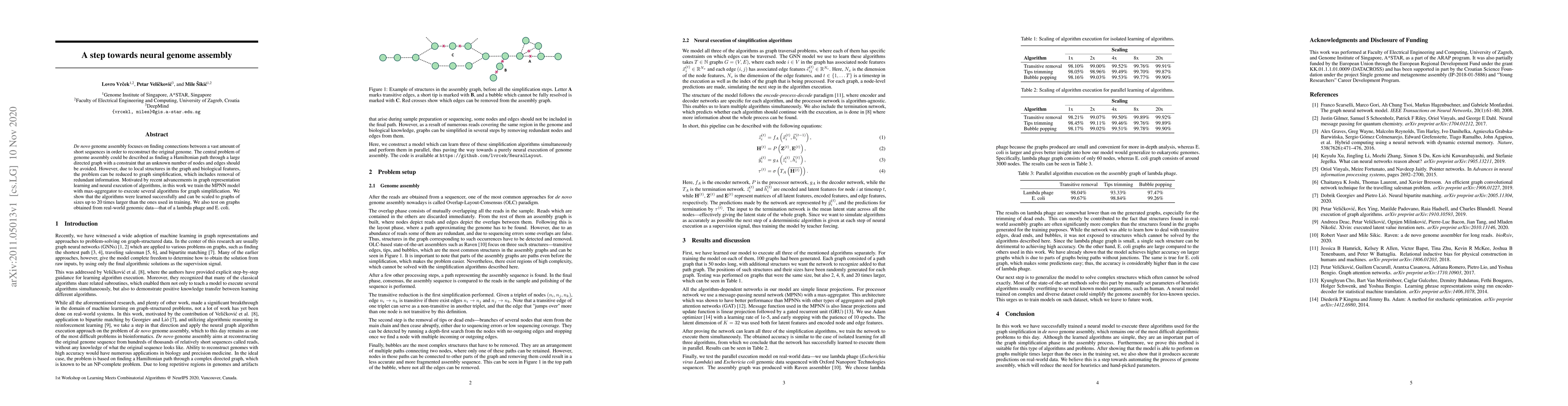 De novo genome assembly focuses on finding connections between a vast amount of short sequences in order to reconstruct the original genome. The central problem of genome assembly could be described as finding a Hamiltonian path through a large directed graph with a constraint that an unknown number of nodes and edges should be avoided. However, due to local structures in the graph and biological features, the problem can be reduced to graph simplification, which includes removal of redundant information. Motivated by recent advancements in graph representation learning and neural execution of algorithms, in this work we train the MPNN model with max-aggregator to execute several algorithms for graph simplification. We show that the algorithms were learned successfully and can be scaled to graphs of sizes up to 20 times larger than the ones used in training. We also test on graphs obtained from real-world genomic data---that of a lambda phage and E. coli.