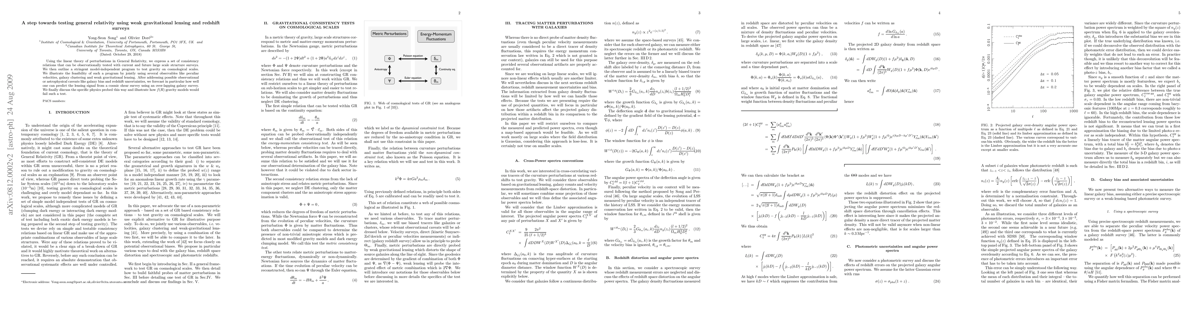 This paper proposes a model-independent observational program to test general relativity using weak gravitational lensing and redshift surveys, demonstrating the feasibility through combined analysis of peculiar velocities, galaxy clustering, and weak lensing. It forecasts the predictive power of cosmic shear surveys and discusses how $f(R)$ gravity models would fail these tests.