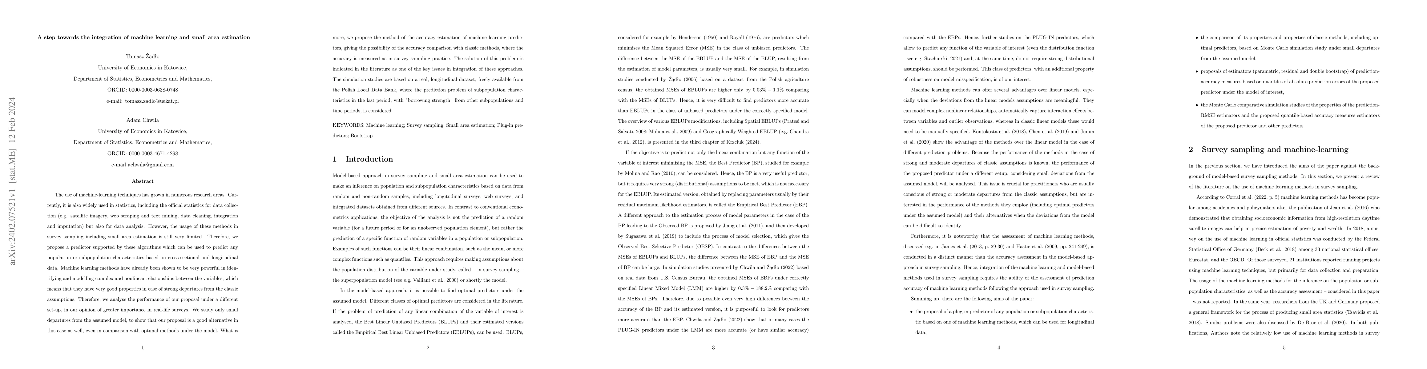 This paper proposes integrating machine learning techniques into small area estimation for predicting population characteristics, leveraging their ability to model complex relationships. It evaluates the performance of the proposed method under small deviations from the assumed model and introduces a method for estimating the accuracy of machine learning predictors, addressing a key issue in combining these approaches.