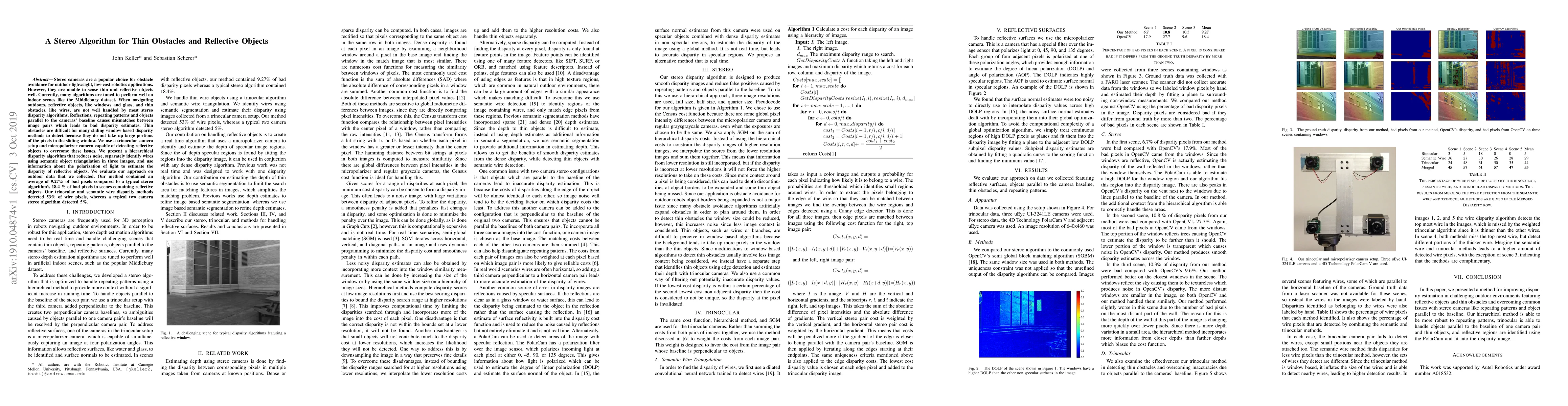 Stereo cameras are a popular choice for obstacle avoidance for outdoor lighweight, low-cost robotics applications. However, they are unable to sense thin and reflective objects well. Currently, many algorithms are tuned to perform well on indoor scenes like the Middlebury dataset. When navigating outdoors, reflective objects, like windows and glass, and thin obstacles, like wires, are not well handled by most stereo disparity algorithms. Reflections, repeating patterns and objects parallel to the cameras' baseline causes mismatches between image pairs which leads to bad disparity estimates. Thin obstacles are difficult for many sliding window based disparity methods to detect because they do not take up large portions of the pixels in the sliding window. We use a trinocular camera setup and micropolarizer camera capable of detecting reflective objects to overcome these issues. We present a hierarchical disparity algorithm that reduces noise, separately identify wires using semantic object triangulation in three images, and use information about the polarization of light to estimate the disparity of reflective objects. We evaluate our approach on outdoor data that we collected. Our method contained an average of 9.27% of bad pixels compared to a typical stereo algorithm's 18.4% of bad pixels in scenes containing reflective objects. Our trinocular and semantic wire disparity methods detected 53% of wire pixels, whereas a typical two camera stereo algorithm detected 5%.