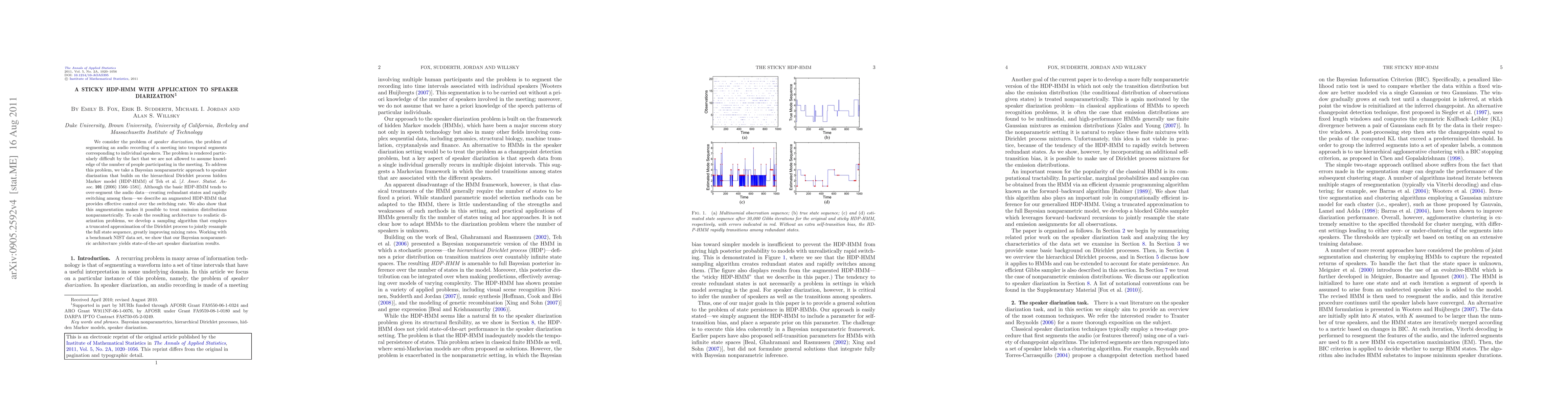 This research paper presents a novel Bayesian nonparametric approach to speaker diarization using an augmented HDP-HMM that controls switching rates and treats emission distributions nonparametrically, achieving state-of-the-art results in speaker diarization.
