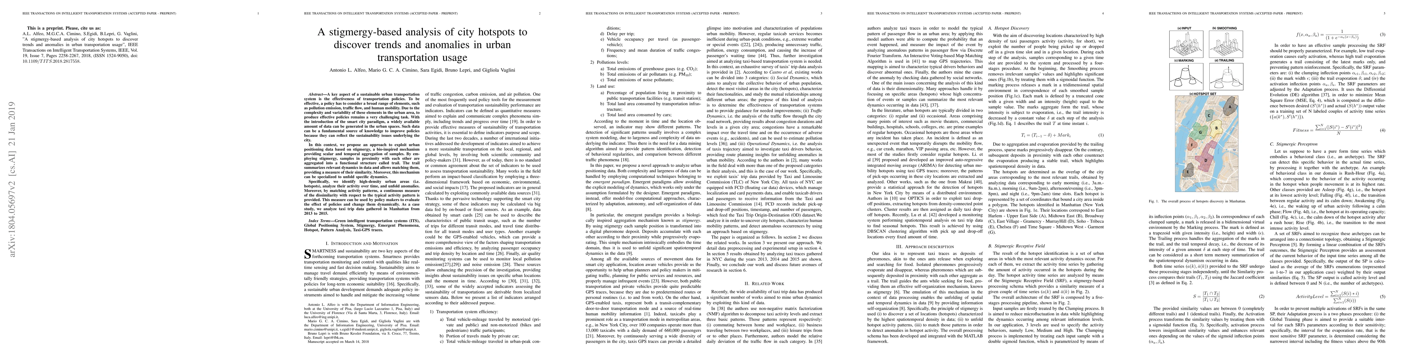 This paper proposes a stigmergy-based method to analyze urban transportation data, identifying city hotspots and detecting trends and anomalies in transportation usage. The approach aggregates data to reveal underlying dynamics, aiding policymakers in evaluating and adjusting transportation policies for sustainability.