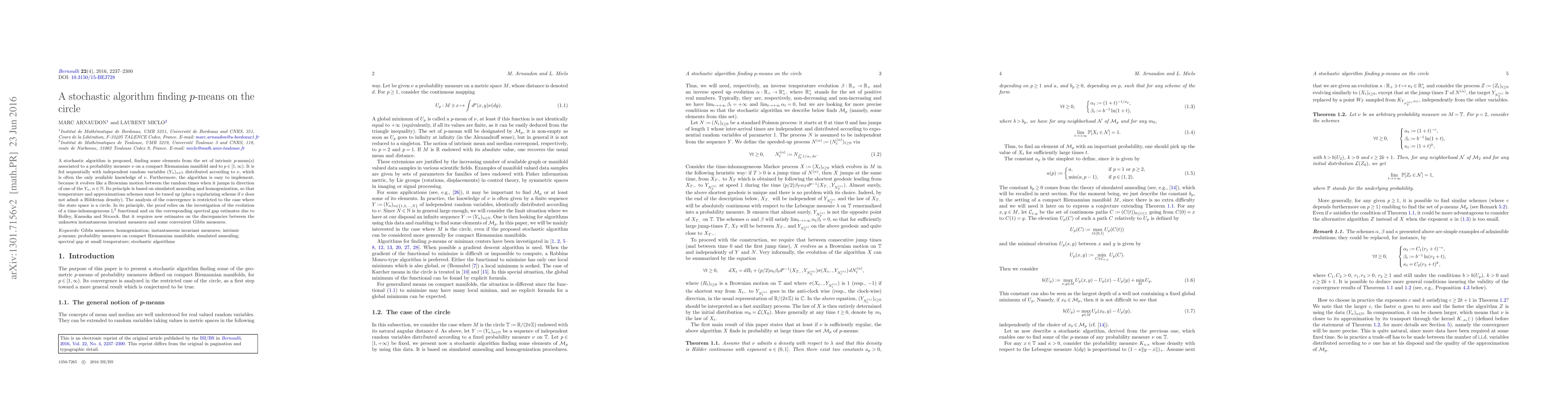 A stochastic algorithm is proposed, finding some elements from the set of intrinsic $p$-mean(s) associated to a probability measure $\nu$ on a compact Riemannian manifold and to $p\in[1,\infty)$. It is fed sequentially with independent random variables $(Y_n)_{n\in \mathbb{N}}$ distributed according to $\nu$, which is often the only available knowledge of $\nu$. Furthermore, the algorithm is easy to implement, because it evolves like a Brownian motion between the random times when it jumps in direction of one of the $Y_n$, $n\in\mathbb{N}$. Its principle is based on simulated annealing and homogenization, so that temperature and approximations schemes must be tuned up (plus a regularizing scheme if $\nu$ does not admit a H\"{o}lderian density). The analysis of the convergence is restricted to the case where the state space is a circle. In its principle, the proof relies on the investigation of the evolution of a time-inhomogeneous $\mathbb{L}^2$ functional and on the corresponding spectral gap estimates due to Holley, Kusuoka and Stroock. But it requires new estimates on the discrepancies between the unknown instantaneous invariant measures and some convenient Gibbs measures.