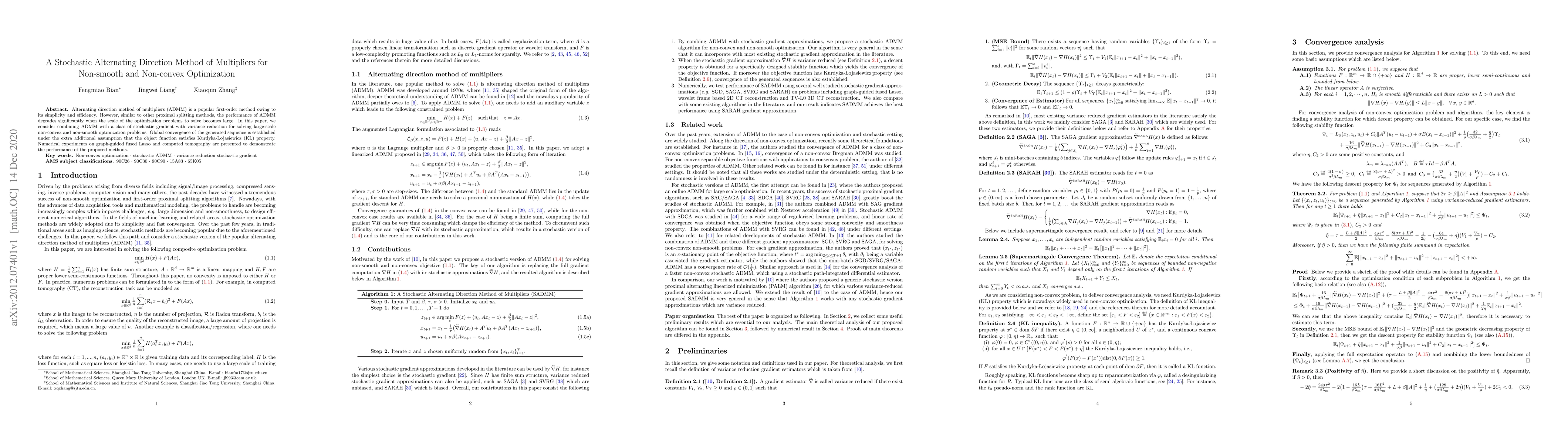 This paper proposes a stochastic variant of the ADMM method for tackling large-scale non-convex and non-smooth optimization problems. It establishes global convergence under the KL property assumption and demonstrates its effectiveness through numerical experiments on graph-guided fused Lasso and computed tomography.