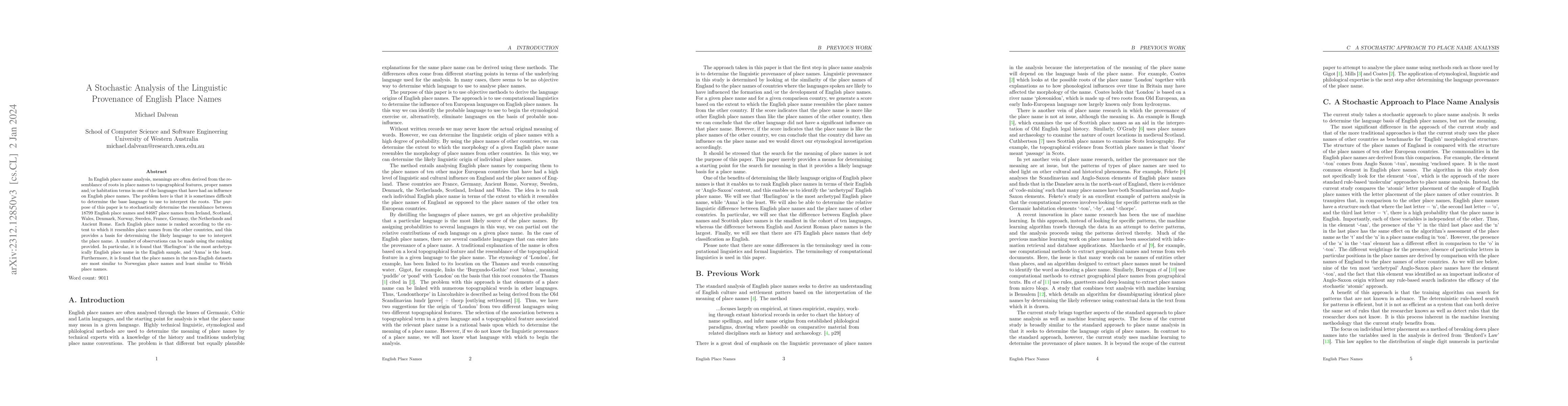 This paper employs stochastic analysis to compare the linguistic origins of 18,799 English place names with those from nine other countries, identifying the most likely base languages for interpretation. The findings reveal that 'Harlington' is the most English-like name, while 'Anna' is the least, and non-English place names are most similar to Norwegian.
