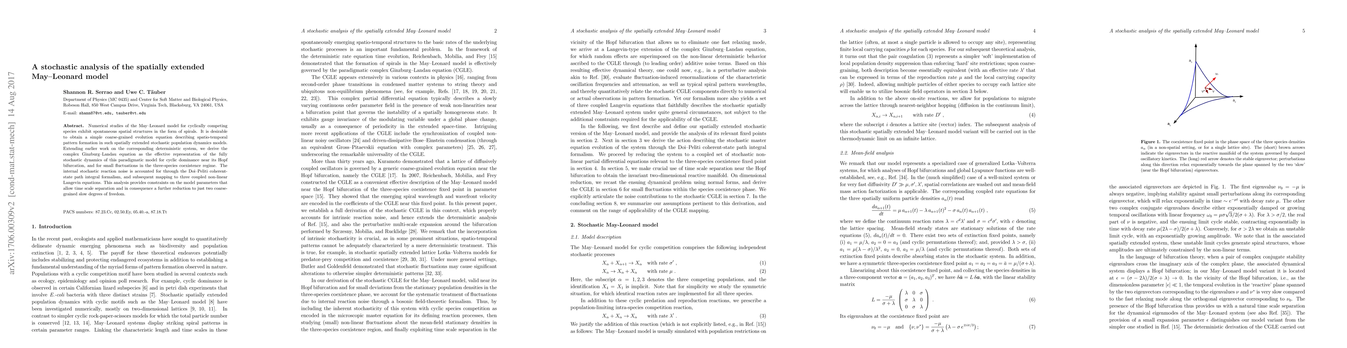 Numerical studies of the May-Leonard model for cyclically competing species exhibit spontaneous spatial structures in the form of spirals. It is desirable to obtain a simple coarse-grained evolution equation describing spatio-temporal pattern formation in such spatially extended stochastic population dynamics models. Extending earlier work on the corresponding deterministic system, we derive the complex Ginzburg-Landau equation as the effective representation of the fully stochastic dynamics of this paradigmatic model for cyclic dominance near its Hopf bifurcation, and for small fluctuations in the three-species coexistence regime. The internal stochastic reaction noise is accounted for through the Doi-Peliti coherent-state path integral formalism, and subsequent mapping to three coupled non-linear Langevin equations. This analysis provides constraints on the model parameters that allow time scale separation and in consequence a further reduction to just two coarse-grained slow degrees of freedom.