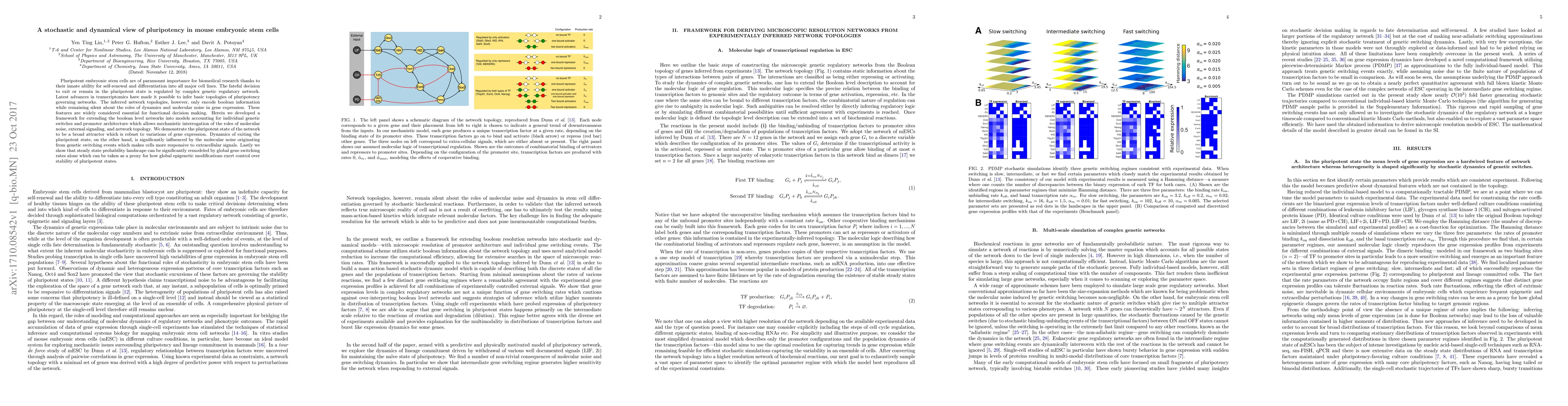 Pluripotent embryonic stem cells are of paramount importance for biomedical research thanks to their innate ability for self-renewal and differentiation into all major cell lines. The fateful decision to exit or remain in the pluripotent state is regulated by complex genetic regulatory network. Latest advances in transcriptomics have made it possible to infer basic topologies of pluripotency governing networks. The inferred network topologies, however, only encode boolean information while remaining silent about the roles of dynamics and molecular noise in gene expression. These features are widely considered essential for functional decision making. Herein we developed a framework for extending the boolean level networks into models accounting for individual genetic switches and promoter architecture which allows mechanistic interrogation of the roles of molecular noise, external signaling, and network topology. We demonstrate the pluripotent state of the network to be a broad attractor which is robust to variations of gene expression. Dynamics of exiting the pluripotent state, on the other hand, is significantly influenced by the molecular noise originating from genetic switching events which makes cells more responsive to extracellular signals. Lastly we show that steady state probability landscape can be significantly remodeled by global gene switching rates alone which can be taken as a proxy for how global epigenetic modifications exert control over stability of pluripotent states.