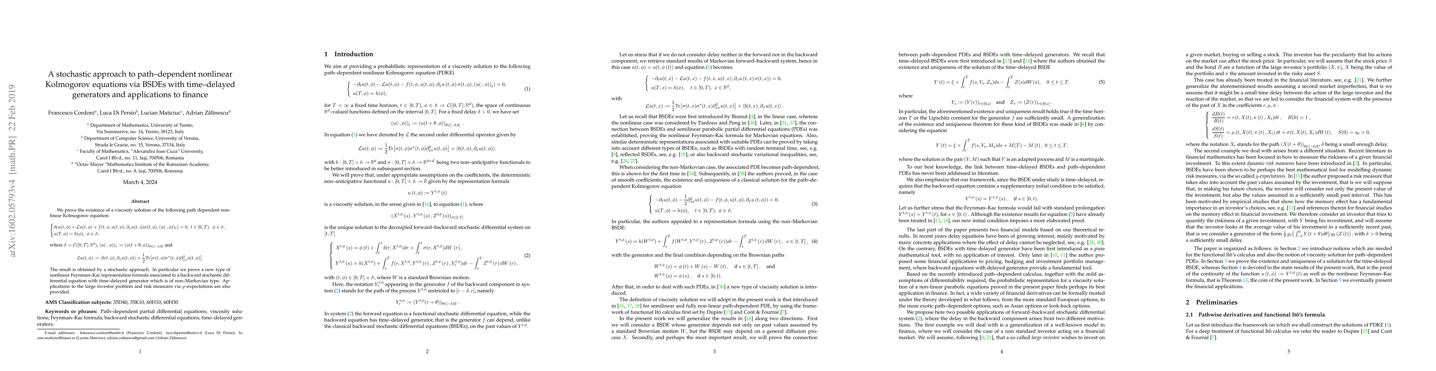 Researchers developed a stochastic approach to solve path-dependent nonlinear Kolmogorov equations, providing a new type of Feynman-Kac representation formula with applications to finance, including the large investor problem and risk measures.