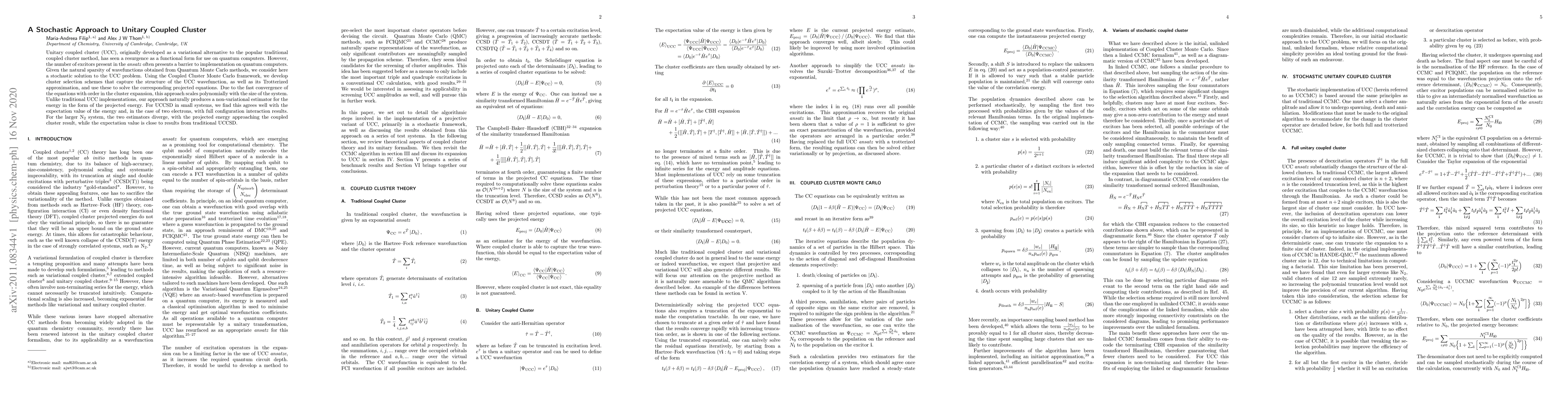 This paper proposes a stochastic approach to solving the Unitary Coupled Cluster (UCC) method using the Coupled Cluster Monte Carlo framework, which addresses the challenge of high excitor count in quantum computer implementations. The method scales polynomially and produces a non-variational estimator for energy, showing good agreement with full configuration interaction results for small systems.