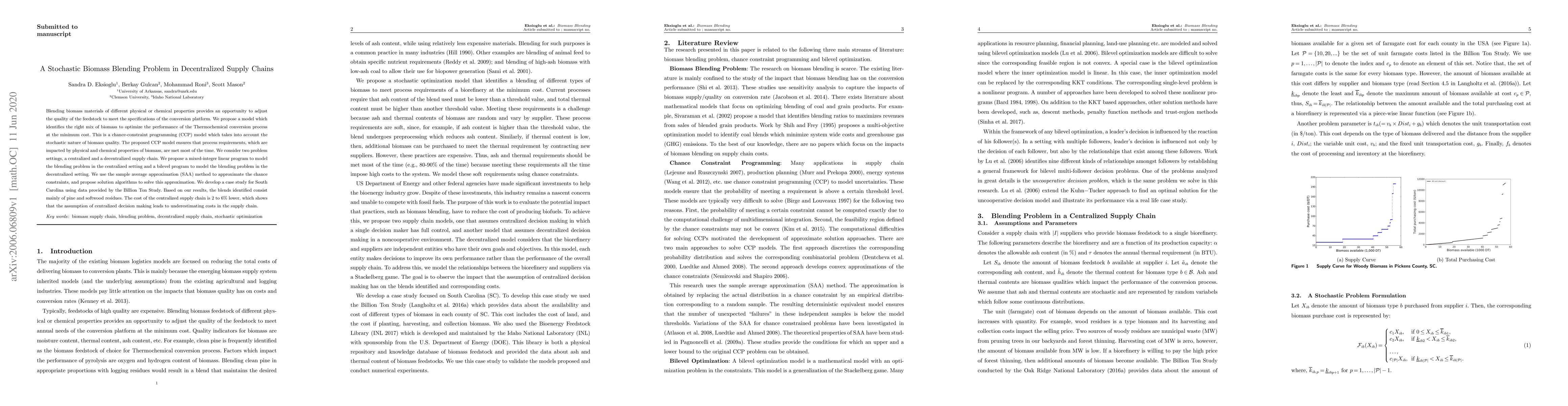 Blending biomass materials of different physical or chemical properties provides an opportunity to adjust the quality of the feedstock to meet the specifications of the conversion platform. We propose a model which identifies the right mix of biomass to optimize the performance of the thermochemical conversion process at the minimum cost. This is a chance-constraint programming (CCP) model which takes into account the stochastic nature of biomass quality. The proposed CCP model ensures that process requirements, which are impacted by physical and chemical properties of biomass, are met most of the time. We consider two problem settings, a centralized and a decentralized supply chain. We propose a mixed-integer linear program to model the blending problem in the centralized setting and a bilevel program to model the blending problem in the decentralized setting. We use the sample average approximation (SAA) method to approximate the chance constraints, and propose solution algorithms to solve this approximation. We develop a case study for South Carolina using data provided by the Billion Ton Study. Based on our results, the blends identified consist mainly of pine and softwood residues. The cost of the centralized supply chain is 2 to 6% lower, which shows that the assumption of centralized decision making leads to underestimating costs in the supply chain.