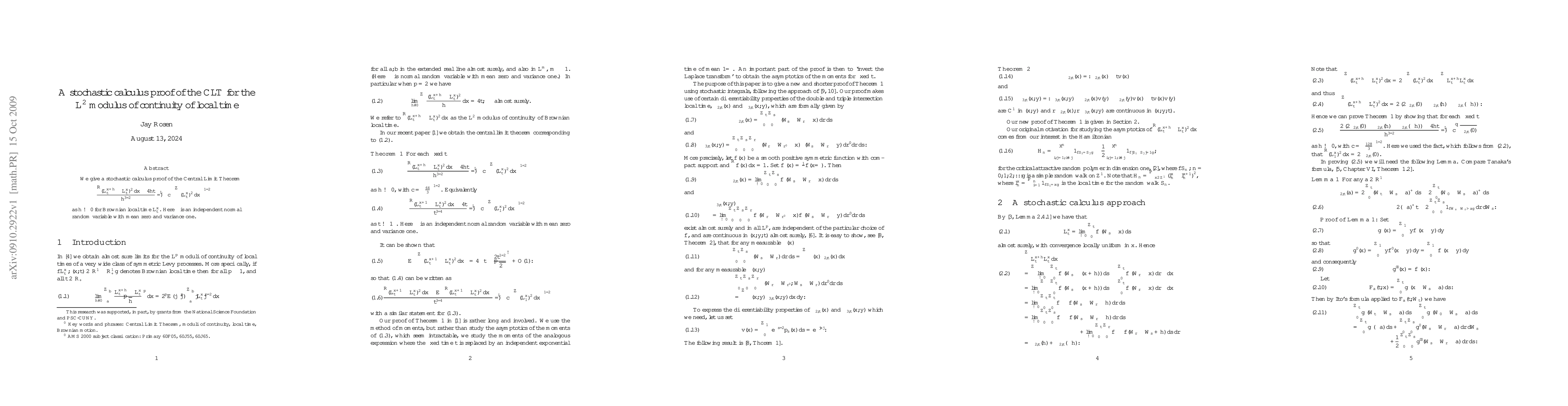 This paper presents a stochastic calculus proof of the Central Limit Theorem for the L² modulus of continuity of Brownian local time, showing that the normalized difference between local time values converges in distribution to a standard normal variable as the time increment approaches zero.