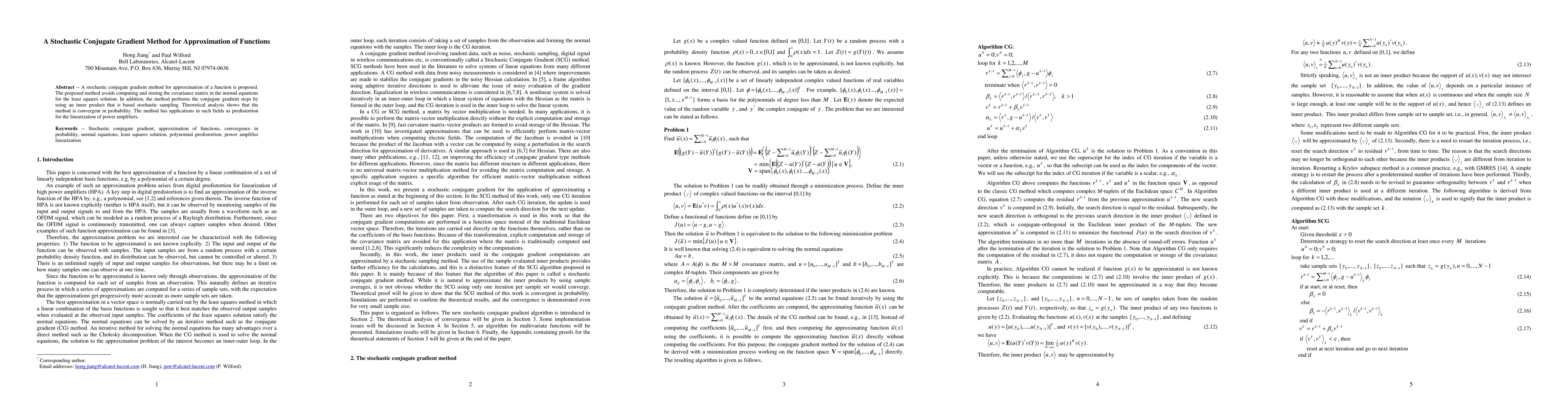 This paper proposes a stochastic conjugate gradient method for function approximation that avoids computing the covariance matrix, utilizing stochastic sampling for inner products, and is shown to be convergent in probability. It has applications in predistortion for linearizing power amplifiers.