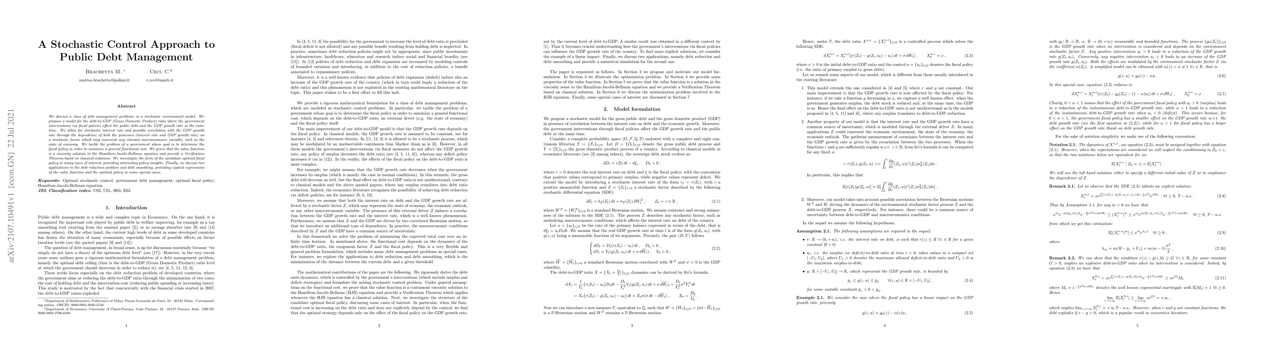 This paper proposes a stochastic control model for public debt management, where government fiscal policies influence both public debt and GDP growth. It uses a Hamilton-Jacobi-Bellman equation to determine optimal fiscal policy minimizing a cost function, providing insights and explicit solutions for debt reduction and smoothing.