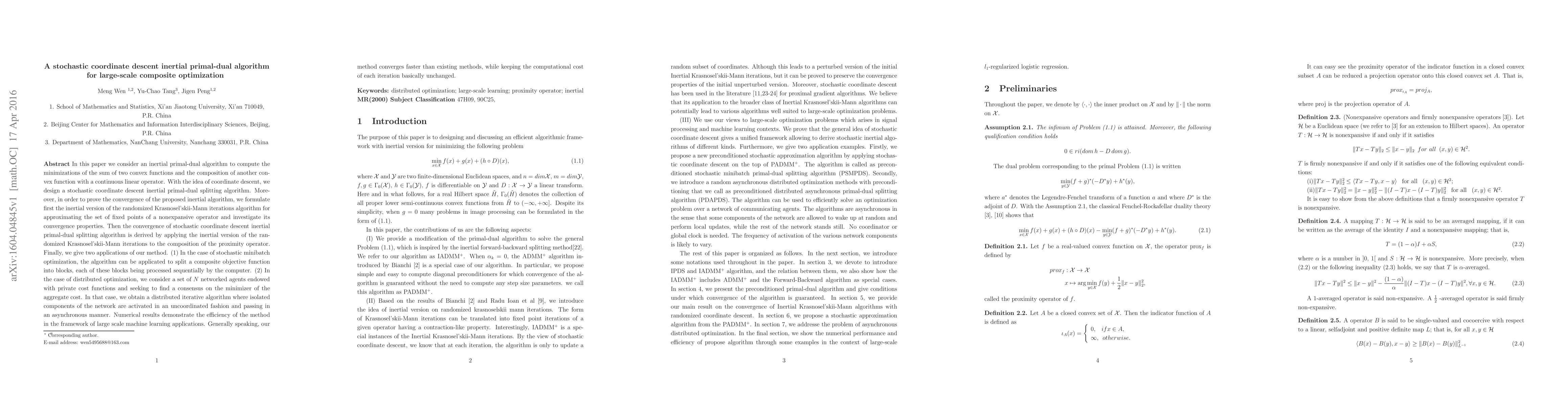 This paper proposes a stochastic coordinate descent inertial primal-dual algorithm for large-scale composite optimization, leveraging an inertial version of the randomized Krasnosel'skii-Mann iterations to ensure convergence and handle the composition of convex functions with linear operators. The algorithm is designed to efficiently minimize the sum of two convex functions.