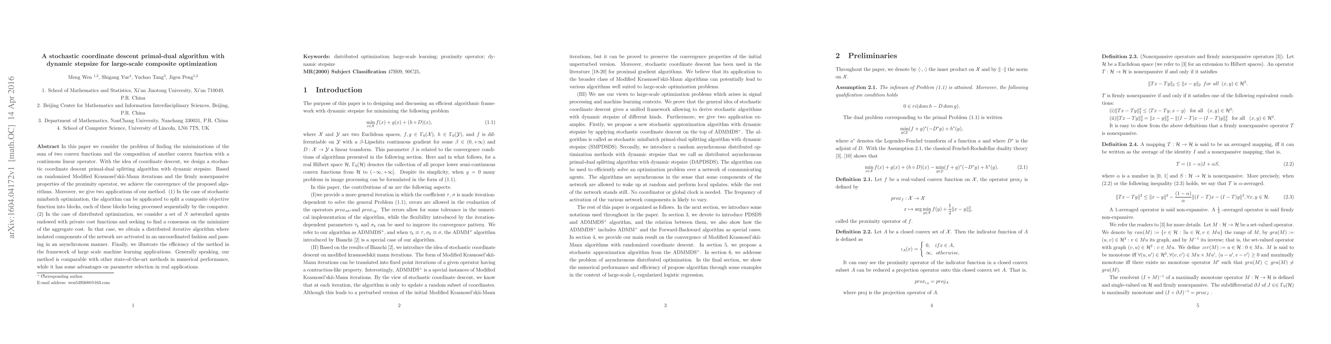 This paper proposes a stochastic coordinate descent primal-dual algorithm with dynamic stepsize for solving large-scale composite optimization problems involving the sum of convex functions and their composition with linear operators. The algorithm leverages randomized iterations and firmly nonexpansive properties to ensure convergence, with two applications demonstrated.