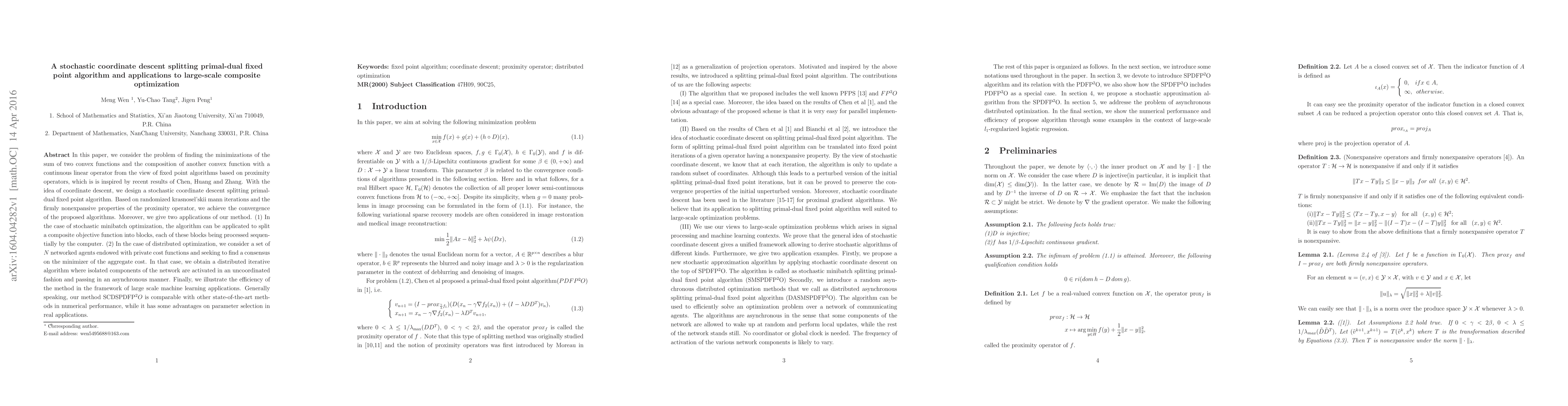 This paper proposes a stochastic coordinate descent splitting primal-dual fixed point algorithm for minimizing the sum of two convex functions and the composition of another convex function with a continuous linear operator. The algorithm converges based on randomized Krasnosel'skii Mann iterations and the firmly nonexpansive properties of the proximity operator.