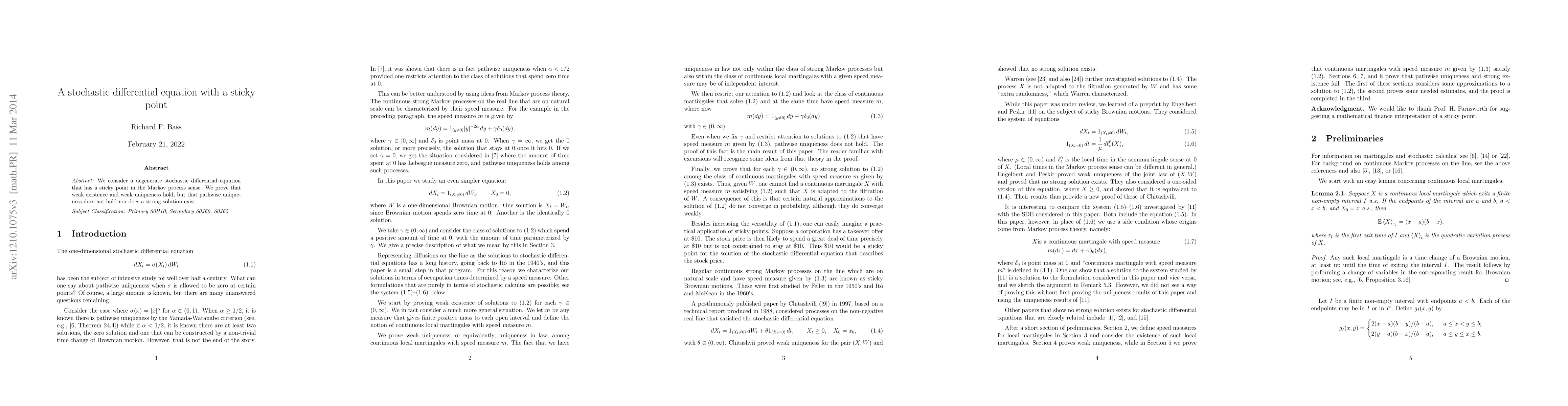 This research investigates a degenerate stochastic differential equation featuring a sticky point, demonstrating weak existence and uniqueness but disproving pathwise uniqueness and the existence of a strong solution.