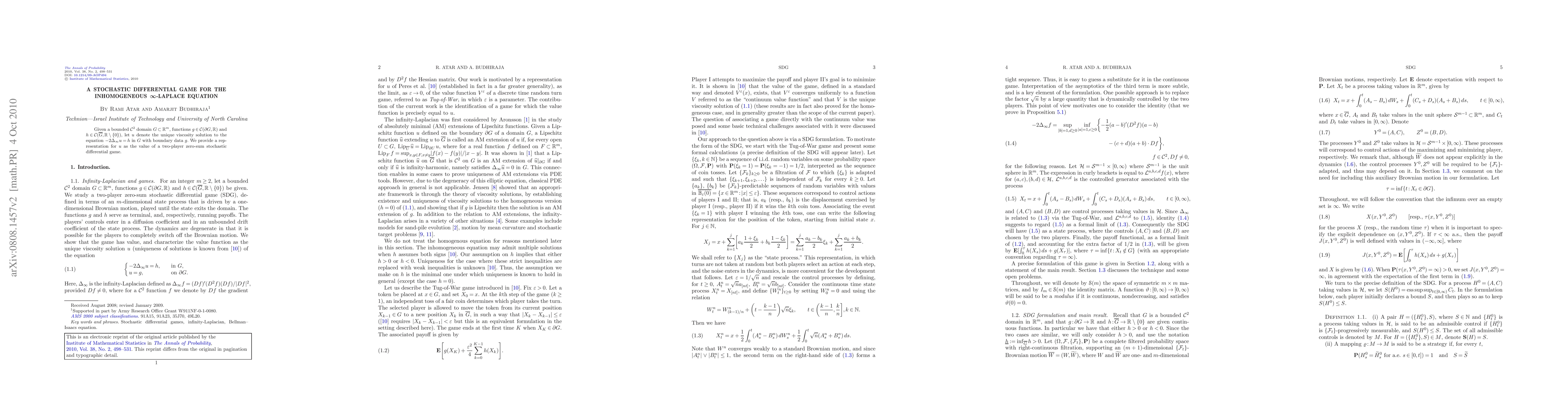 Given a bounded $\mathcaligr{C}^2$ domain $G\subset{\mathbb{R}}^m$, functions $g\in\mathcaligr{C}(\partial G,{\mathbb{R}})$ and $h\in\mathcaligr {C}(\bar{G},{\mathbb{R}}\setminus\{0\})$, let $u$ denote the unique viscosity solution to the equation $-2\Delta_{\infty}u=h$ in $G$ with boundary data $g$. We provide a representation for $u$ as the value of a two-player zero-sum stochastic differential game.