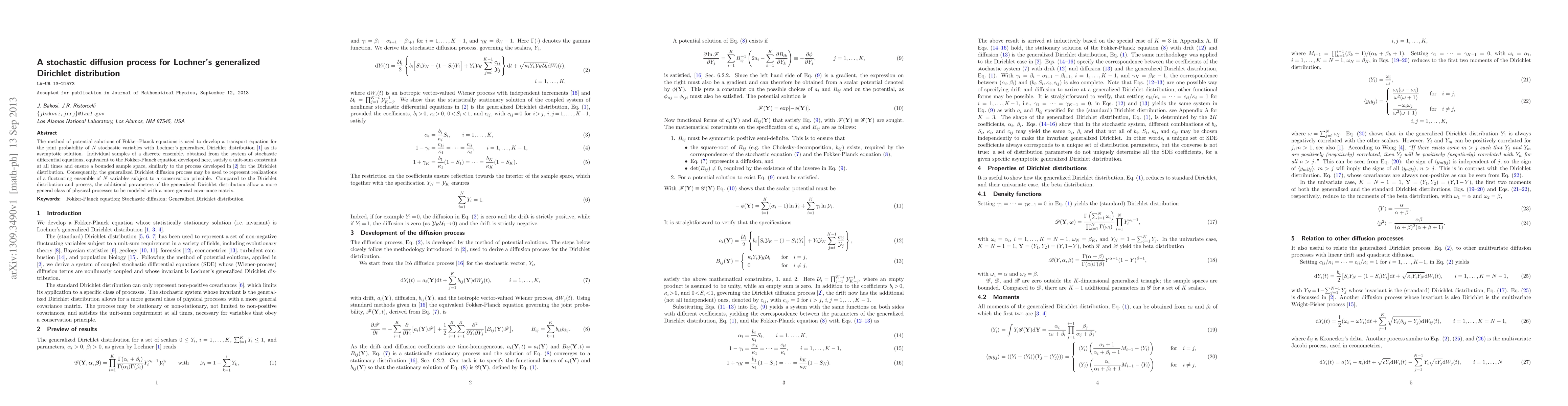 This paper develops a stochastic diffusion process for Lochner's generalized Dirichlet distribution using Fokker-Planck equations, providing a transport equation for N stochastic variables. The process models a fluctuating ensemble of variables under a conservation principle, with additional parameters allowing for a broader range of physical processes.