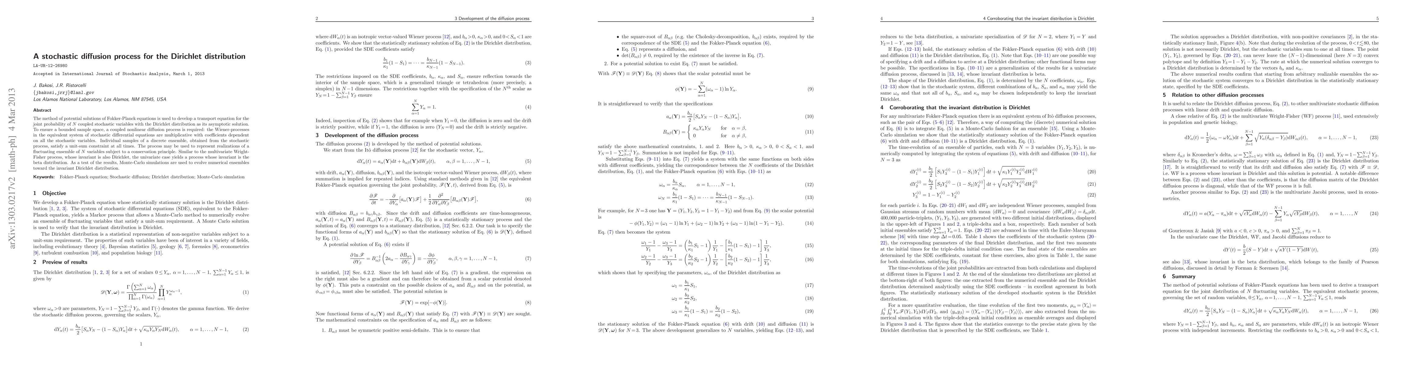 This paper develops a stochastic diffusion process for the Dirichlet distribution using Fokker-Planck equations, ensuring bounded samples through multiplicative Wiener-processes. Monte-Carlo simulations validate the process, showing it represents fluctuating ensembles of N variables under conservation principles.