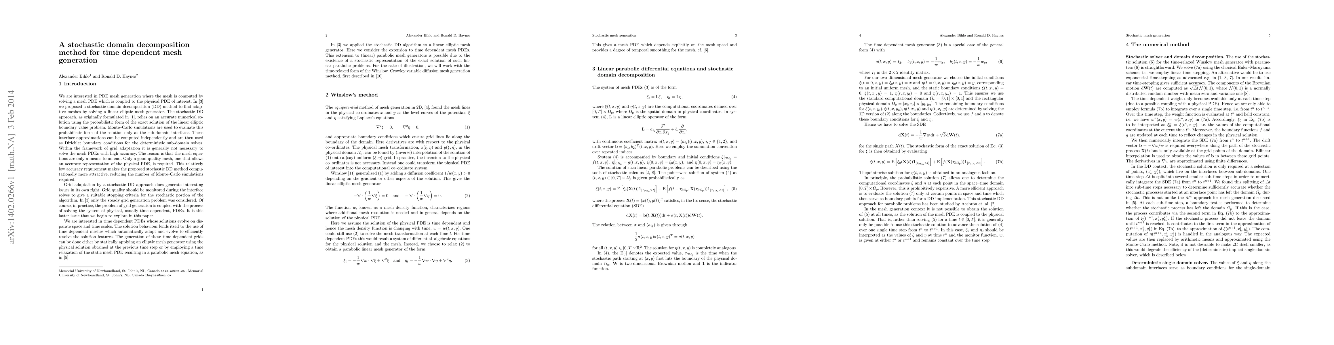 We use a time-relaxed linear grid generator of Winslow type to propose a new deterministic-stochastic domain decomposition approach to the generation of adaptive moving meshes. The method uses the probabilistic form of the exact solution of the linear mesh generator to provide the sub-domain interface values that serve as boundary conditions for the domain decomposition. The meshes over the single sub-domains can then be obtained independently of each other in an entirely parallel fashion. We demonstrate numerically the capability of the method to yield smooth, time-evolving meshes.