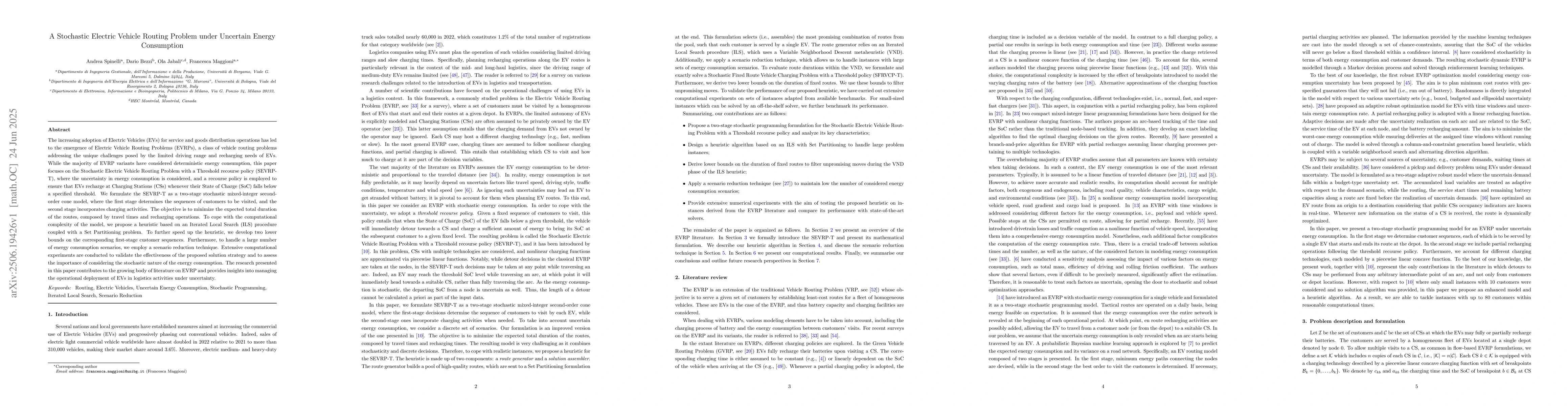 This research tackles the challenge of uncertain energy consumption in Electric Vehicle Routing Problems (EVRPs). It proposes a two-stage stochastic model, SEVRP-T, to minimize expected route duration, incorporating a recharge policy when SoC falls below a threshold. A heuristic using Iterated Local Search and Set Partitioning is developed to address computational complexity, along with scenario reduction for numerous energy scenarios. The method's effectiveness is validated through extensive experiments, contributing to EV logistics management under uncertainty.