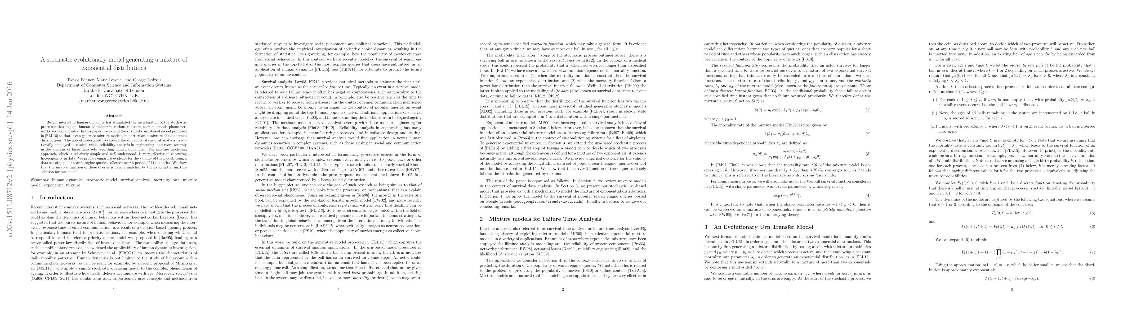 Recent interest in human dynamics has stimulated the investigation of the stochastic processes that explain human behaviour in various contexts, such as mobile phone networks and social media. In this paper, we extend the stochastic urn-based model proposed in \cite{FENN15} so that it can generate mixture models,in particular, a mixture of exponential distributions. The model is designed to capture the dynamics of survival analysis, traditionally employed in clinical trials, reliability analysis in engineering, and more recently in the analysis of large data sets recording human dynamics. The mixture modelling approach, which is relatively simple and well understood, is very effective in capturing heterogeneity in data. We provide empirical evidence for the validity of the model, using a data set of popular search engine queries collected over a period of 114 months. We show that the survival function of these queries is closely matched by the exponential mixture solution for our model.