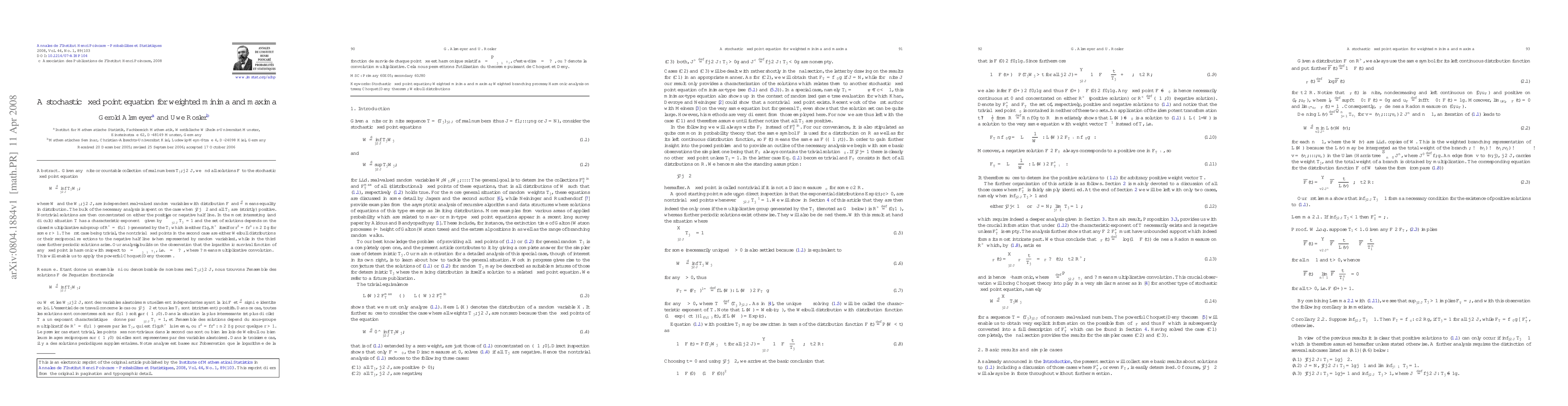 This paper presents a solution to a stochastic fixed point equation involving weighted minima of independent random variables with a given distribution. It identifies nontrivial solutions concentrated on either the positive or negative half-line, depending on the positive weights T_j. The analysis hinges on the logarithmic survival function's harmonic property with respect to the measure Λ. The solution set's nature varies based on the multiplicative subgroup generated by T_j, encompassing Weibull distributions and their reflections, along with additional periodic solutions in certain cases.