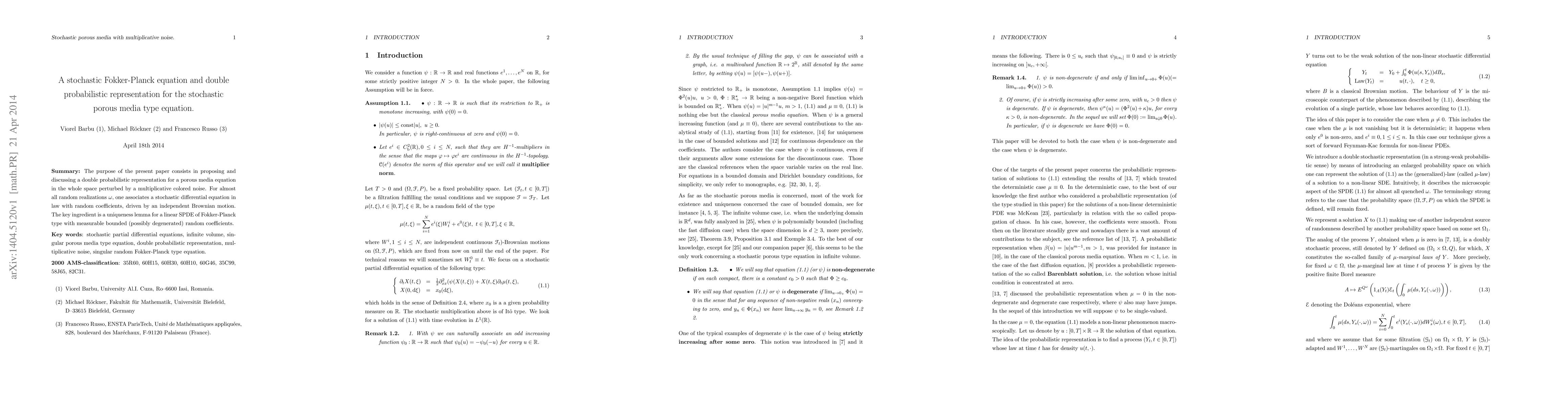 The purpose of the present paper consists in proposing and discussing a double probabilistic representation for a porous media equation in the whole space perturbed by a multiplicative colored noise. For almost all random realizations $\omega$, one associates a stochastic differential equation in law with random coefficients, driven by an independent Brownian motion. The key ingredient is a uniqueness lemma for a linear SPDE of Fokker-Planck type with measurable bounded (possibly degenerated) random coefficients.