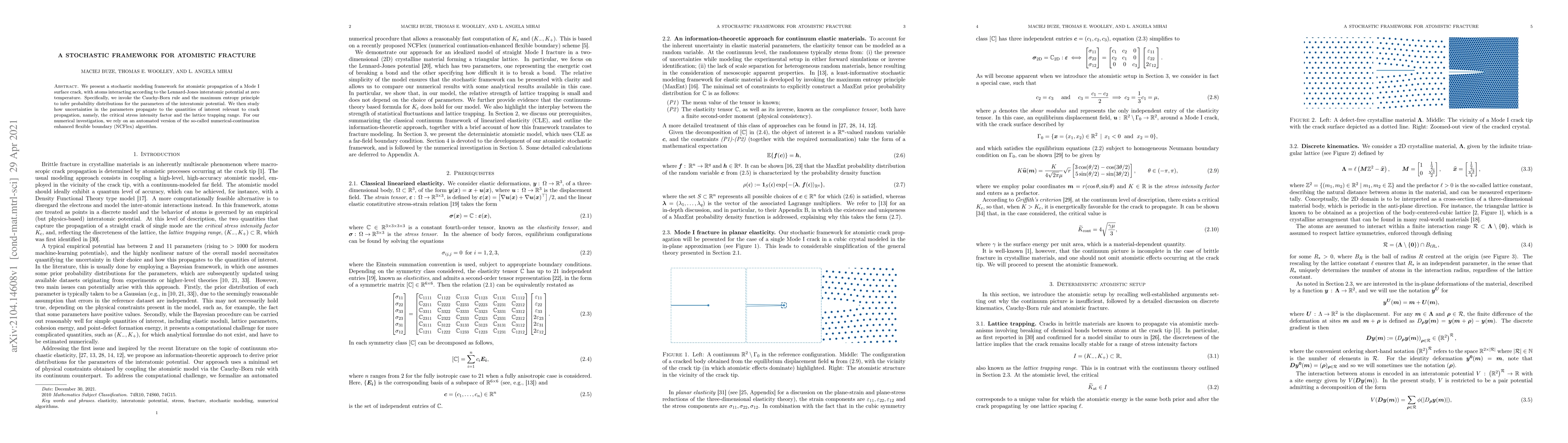 This paper presents a stochastic framework for modeling atomistic fracture, using uncertainty in interatomic potential parameters to predict critical stress intensity factor and lattice trapping range.