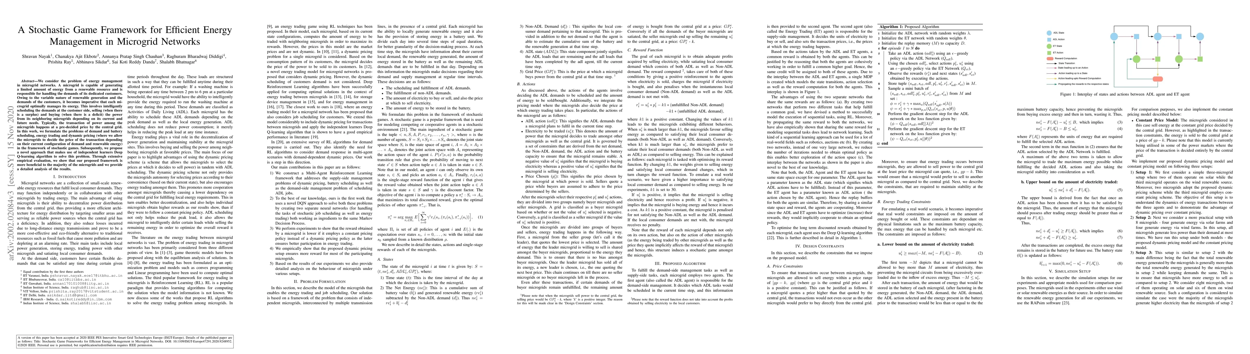 We consider the problem of energy management in microgrid networks. A microgrid is capable of generating a limited amount of energy from a renewable resource and is responsible for handling the demands of its dedicated customers. Owing to the variable nature of renewable generation and the demands of the customers, it becomes imperative that each microgrid optimally manages its energy. This involves intelligently scheduling the demands at the customer side, selling (when there is a surplus) and buying (when there is a deficit) the power from its neighboring microgrids depending on its current and future needs. Typically, the transaction of power among the microgrids happens at a pre-decided price by the central grid. In this work, we formulate the problems of demand and battery scheduling, energy trading and dynamic pricing (where we allow the microgrids to decide the price of the transaction depending on their current configuration of demand and renewable energy) in the framework of stochastic games. Subsequently, we propose a novel approach that makes use of independent learners Deep Q-learning algorithm to solve this problem. Through extensive empirical evaluation, we show that our proposed framework is more beneficial to the majority of the microgrids and we provide a detailed analysis of the results.