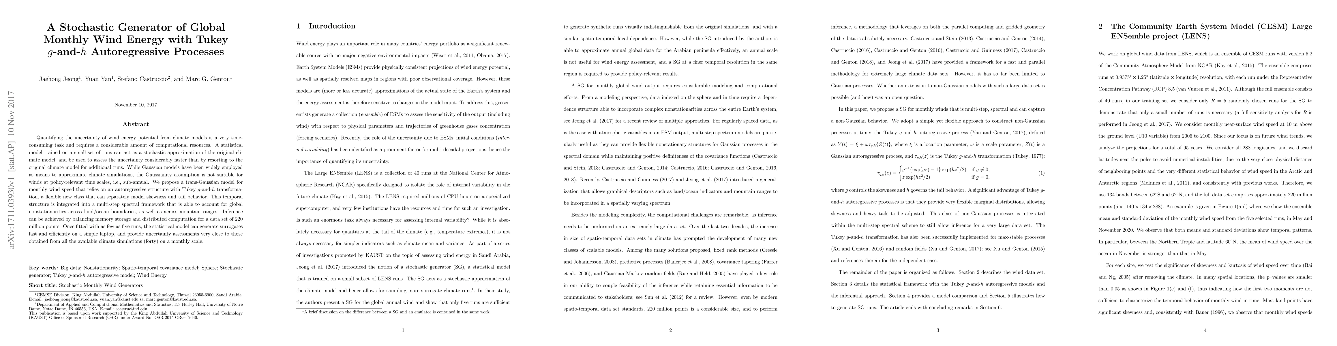 A new statistical model uses a trans-Gaussian process with Tukey $g$-and-$h$ autoregressive processes to predict monthly wind energy, providing fast and efficient uncertainty assessments. The model can generate surrogates from as few as five runs and is computationally feasible for large datasets.