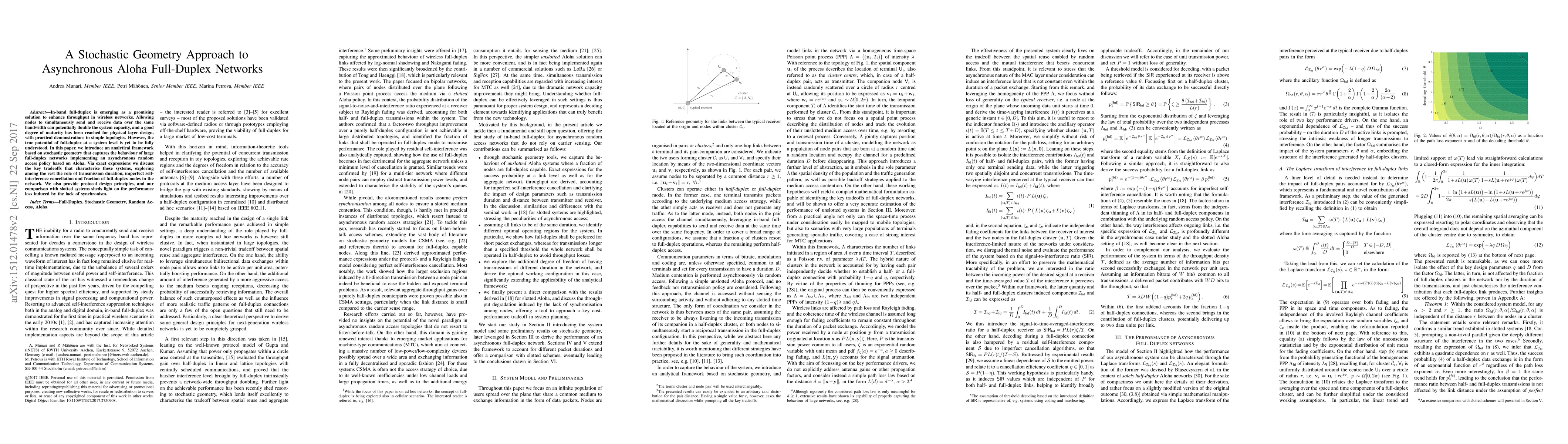 This paper develops an analytical framework using stochastic geometry to analyze the behavior of large full-duplex networks employing asynchronous Aloha protocols. It explores key tradeoffs, including transmission duration and self-interference cancellation, and provides insights into protocol design and performance compared to slotted systems.