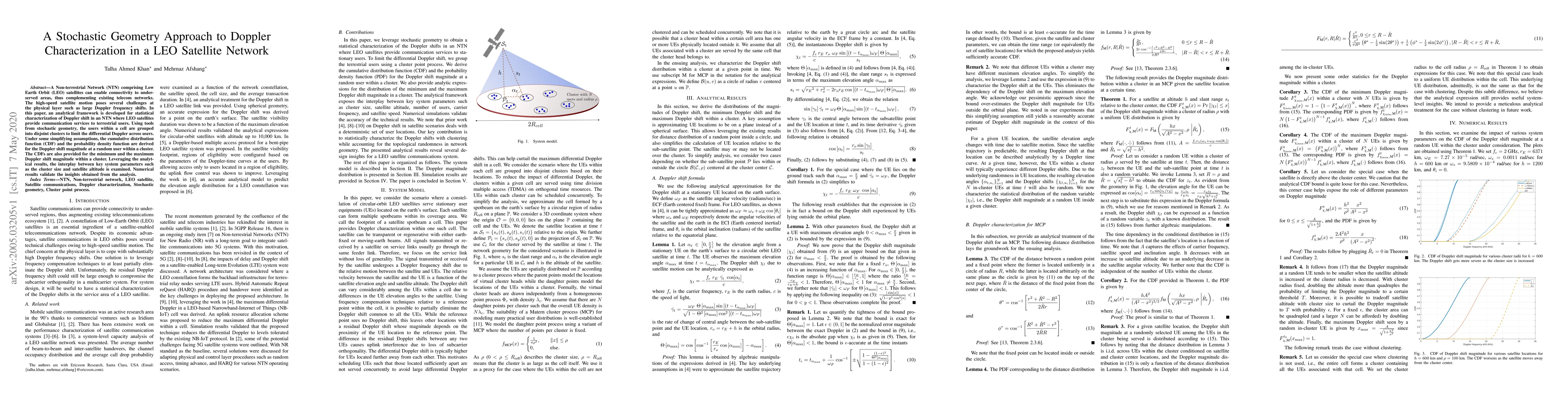This paper develops an analytical framework using stochastic geometry to statistically characterize Doppler shifts in a Low Earth Orbit (LEO) satellite network. It derives the cumulative distribution function and probability density function for Doppler shifts within user clusters, examining the impact of cluster size and satellite altitude on these shifts.