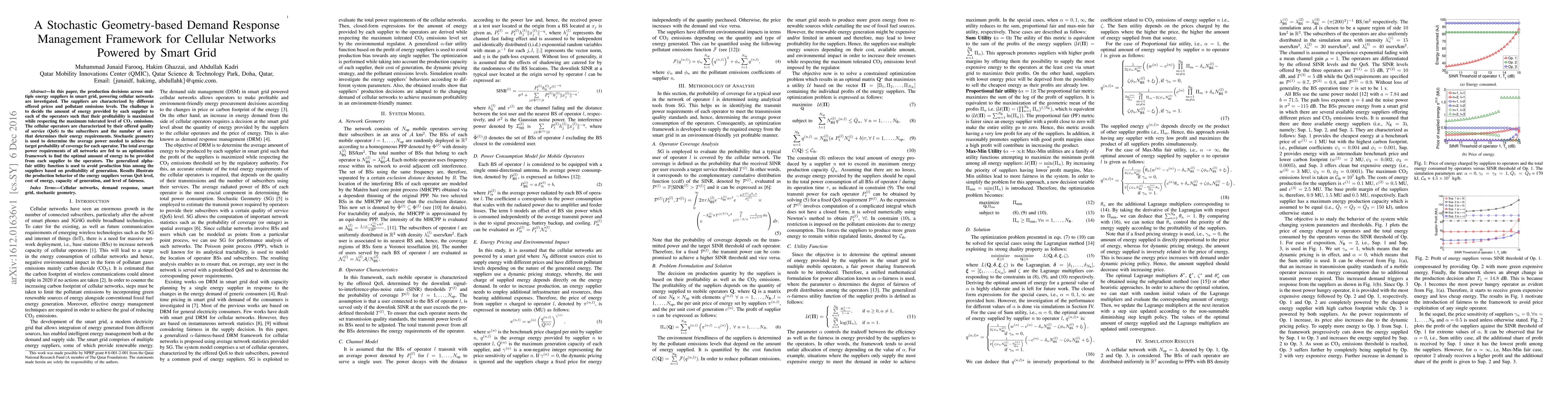 In this paper, the production decisions across multiple energy suppliers in smart grid, powering cellular networks are investigated. The suppliers are characterized by different offered prices and pollutant emissions levels. The challenge is to decide the amount of energy provided by each supplier to each of the operators such that their profitability is maximized while respecting the maximum tolerated level of CO2 emissions. The cellular operators are characterized by their offered quality of service (QoS) to the subscribers and the number of users that determines their energy requirements. Stochastic geometry is used to determine the average power needed to achieve the target probability of coverage for each operator. The total average power requirements of all networks are fed to an optimization framework to find the optimal amount of energy to be provided from each supplier to the operators. The generalized $\alpha$-fair utility function is used to avoid production bias among the suppliers based on profitability of generation. Results illustrate the production behavior of the energy suppliers versus QoS level, cost of energy, capacity of generation, and level of fairness.
