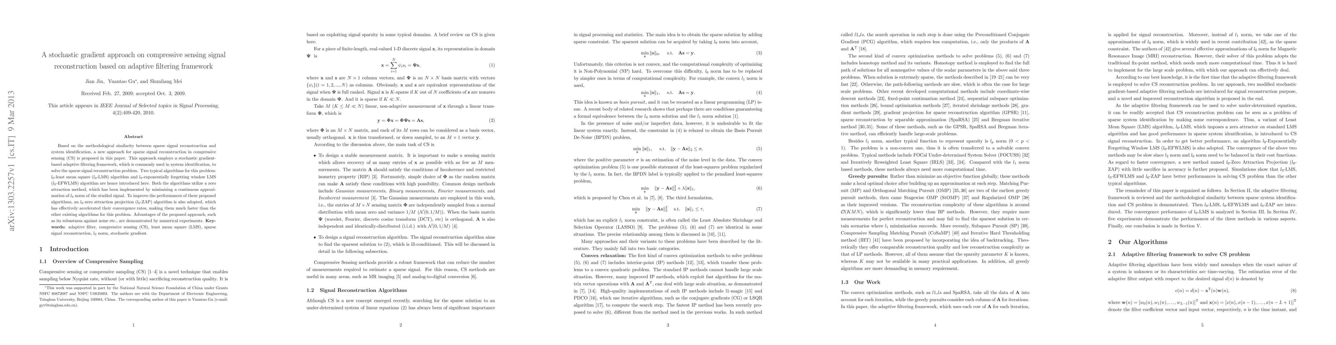 This paper proposes a stochastic gradient-based adaptive filtering framework for compressive sensing signal reconstruction, introducing $l_0$-LMS and $l_0$-EFWLMS algorithms enhanced by $l_0$-ZAP to accelerate convergence and demonstrate robustness against noise. Numerical experiments validate the effectiveness of the proposed approach.