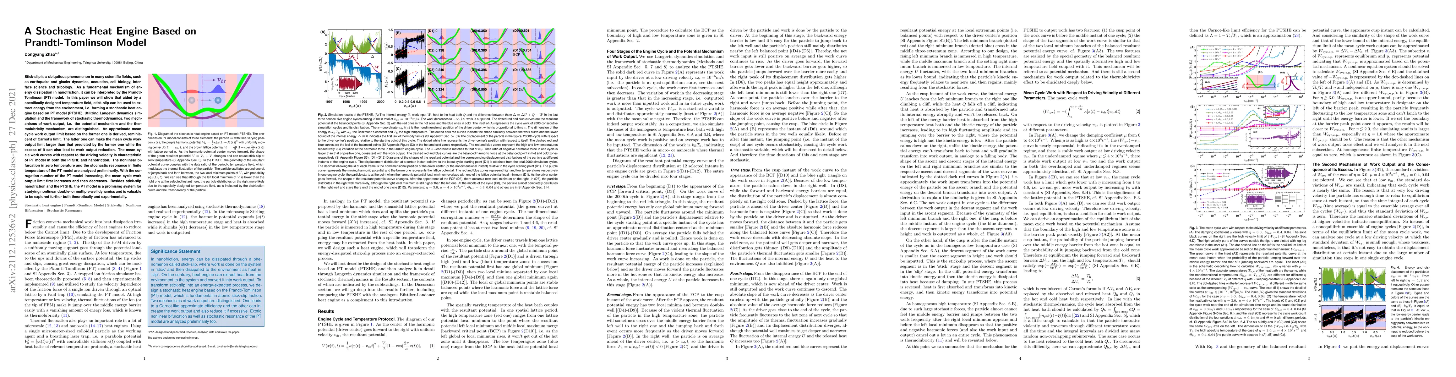 Stick-slip is a ubiquitous phenomenon in many scientific fields, such as earthquake and glacier dynamics, acoustics, cell biology, interface science and tribology. As a fundamental mechanism of energy dissipation in nanofriction, it can be interpreted by the Prandtl-Tomlinson (PT) model. In this paper we will show that aided by a specifically designed temperature field, stick-slip can be used to extract energy from the environment, i.e. forming a stochastic heat engine based on PT model (PTSHE). Utilizing Langevin dynamics simulation and the framework of stochastic thermodynamics, two mechanisms of work output, i.e. the potential mechanism and the thermolubricity mechanism, are distinguished. An approximate mean cycle work output limit based on the former one is derived, reminiscent of Carnot's limit. The latter one can make the mean cycle work output limit larger than that predicted by the former one while the excess of it can also lead to work output reduction. The mean cycle work curves with respect to the driving velocity is characteristic of PT model in both the PTSHE and nanofriction. The nonlinear bifurcation in zero temperature and the stochastic resonance in finite temperature of the PT model are analyzed preliminarily. With the corrugation number of the PT model increasing, the mean cycle work output limit first increases and then decreases. Besides stick-slip nanofriction and the PTSHE, the PT model is a promising system for studying nonlinear double- or multiple-well dynamics and is valuable to be explored further both theoretically and experimentally.