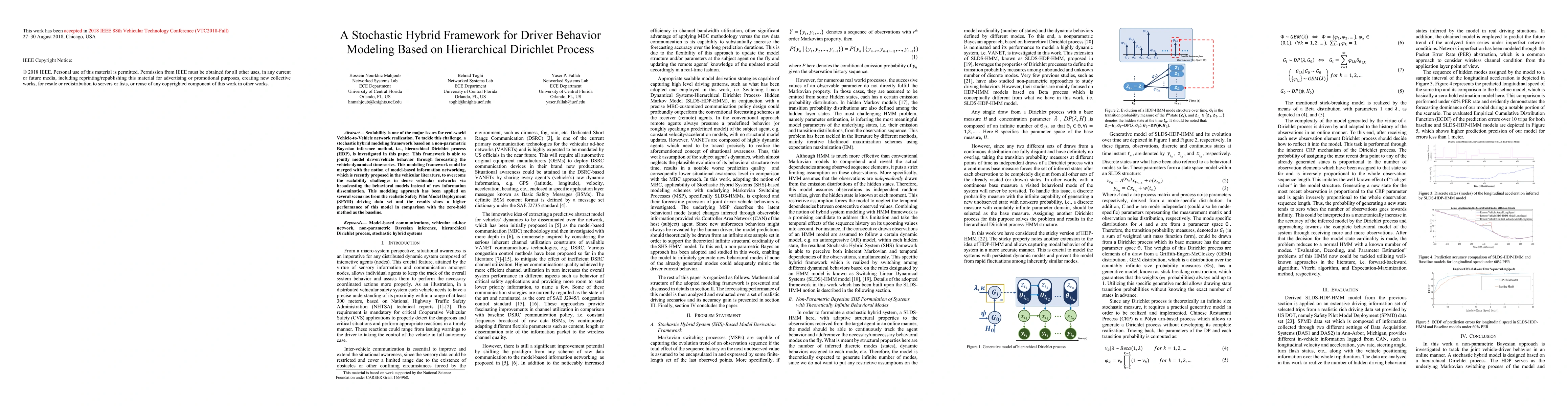 Scalability is one of the major issues for real-world Vehicle-to-Vehicle network realization. To tackle this challenge, a stochastic hybrid modeling framework based on a non-parametric Bayesian inference method, i.e., hierarchical Dirichlet process (HDP), is investigated in this paper. This framework is able to jointly model driver/vehicle behavior through forecasting the vehicle dynamical time-series. This modeling framework could be merged with the notion of model-based information networking, which is recently proposed in the vehicular literature, to overcome the scalability challenges in dense vehicular networks via broadcasting the behavioral models instead of raw information dissemination. This modeling approach has been applied on several scenarios from the realistic Safety Pilot Model Deployment (SPMD) driving data set and the results show a higher performance of this model in comparison with the zero-hold method as the baseline.