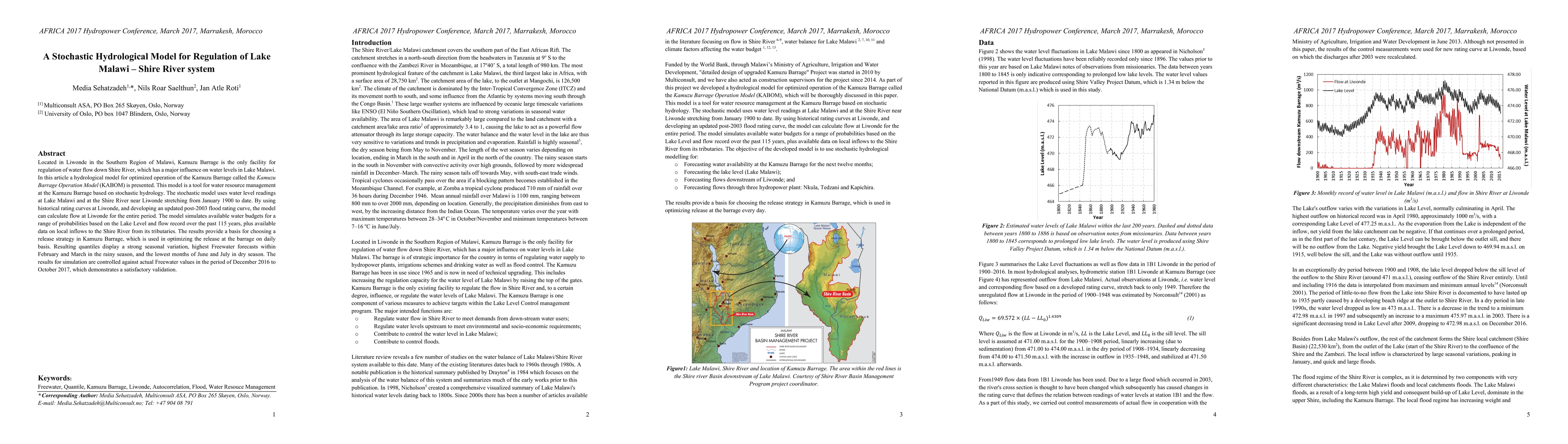 Located in Liwonde in the Southern Region of Malawi, Kamuzu Barrage is the only facility for regulation of water flow down Shire River, which has a major influence on water levels in Lake Malawi. In this article a hydrological model for optimized operation of the Kamuzu Barrage called the Kamuzu Barrage Operation Model (KABOM) is presented. This model is a tool for water resource management at the Kamuzu Barrage based on stochastic hydrology. The stochastic model uses water level readings at Lake Malawi and at the Shire River near Liwonde stretching from January 1900 to date. By using historical rating curves at Liwonde, and developing an updated post-2003 flood rating curve, the model can calculate flow at Liwonde for the entire period. The model simulates available water budgets for a range of probabilities based on the Lake Level and flow record over the past 115 years, plus available data on local inflows to the Shire River from its tributaries. The results provide a basis for choosing a release strategy in Kamuzu Barrage, which is used in optimizing the release at the barrage on daily basis. Resulting quantiles display a strong seasonal variation, highest Freewater forecasts within February and March in the rainy season, and the lowest months of June and July in dry season. The results for simulation are controlled against actual Freewater values in the period of December 2016 to October 2017, which demonstrates a satisfactory validation
