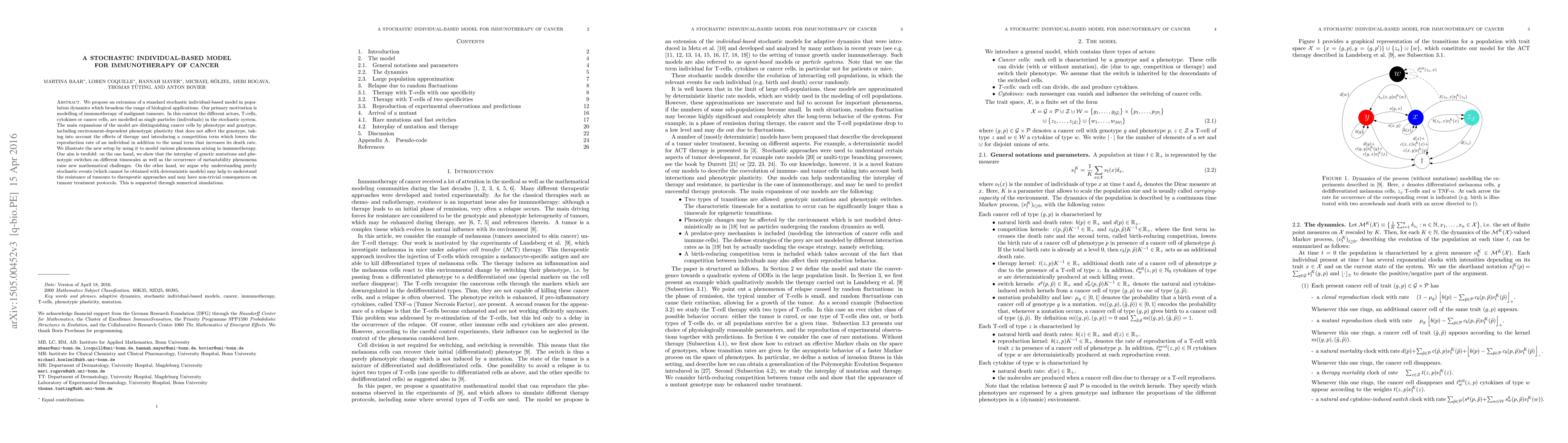 We propose an extension of a standard stochastic individual-based model in population dynamics which broadens the range of biological applications. Our primary motivation is modelling of immunotherapy of malignant tumours. In this context the different actors, T-cells, cytokines or cancer cells, are modelled as single particles (individuals) in the stochastic system. The main expansions of the model are distinguishing cancer cells by phenotype and genotype, including environment-dependent phenotypic plasticity that does not affect the genotype, taking into account the effects of therapy and introducing a competition term which lowers the reproduction rate of an individual in addition to the usual term that increases its death rate. We illustrate the new setup by using it to model various phenomena arising in immunotherapy. Our aim is twofold: on the one hand, we show that the interplay of genetic mutations and phenotypic switches on different timescales as well as the occurrence of metastability phenomena raise new mathematical challenges. On the other hand, we argue why understanding purely stochastic events (which cannot be obtained with deterministic models) may help to understand the resistance of tumours to therapeutic approaches and may have non-trivial consequences on tumour treatment protocols. This is supported through numerical simulations.