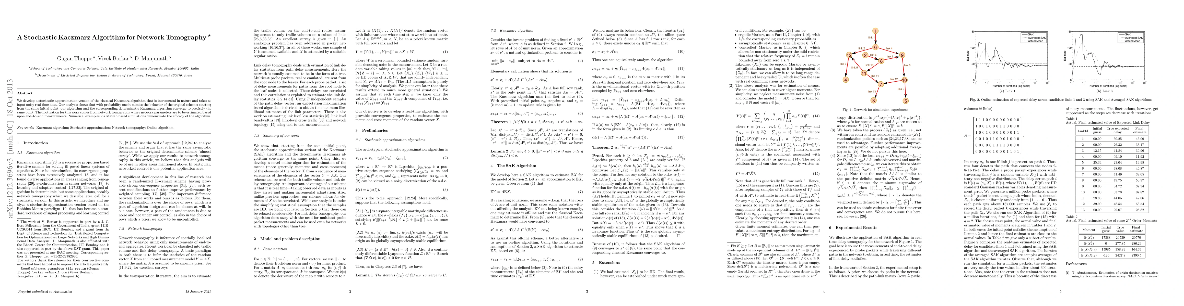 A stochastic Kaczmarz algorithm for network tomography is proposed, which converges to the same point as a deterministic version with probability one, enabling efficient estimation of network parameters from noisy real-time data.