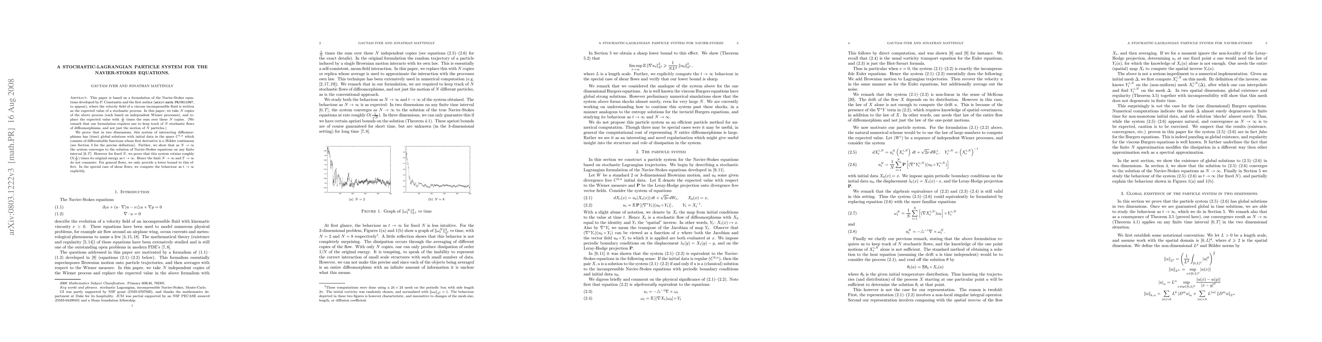 This paper develops a stochastic-Lagrangian particle system for the Navier-Stokes equations, proving global solutions in two dimensions for initial data in $\holderspace{1}{\alpha}$. It shows convergence to the Navier-Stokes solution as $N \to \infty$, but the limit and $T \to \infty$ do not commute.