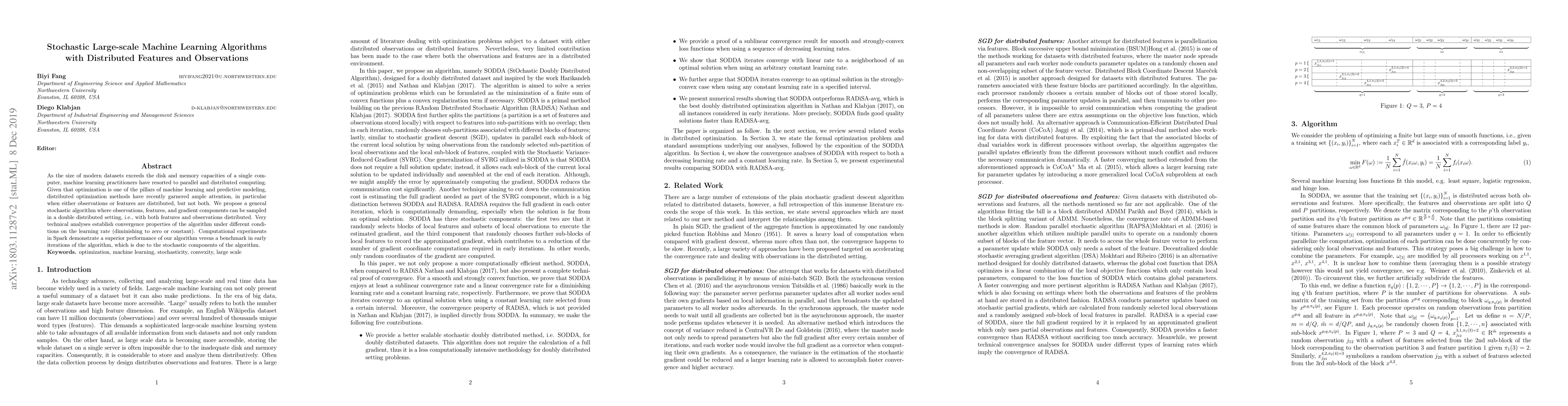 This paper proposes a novel stochastic algorithm for distributed optimization in large-scale machine learning, addressing scenarios where both features and observations are distributed. The algorithm's convergence properties are rigorously analyzed, and computational experiments show its superior early performance compared to a benchmark.