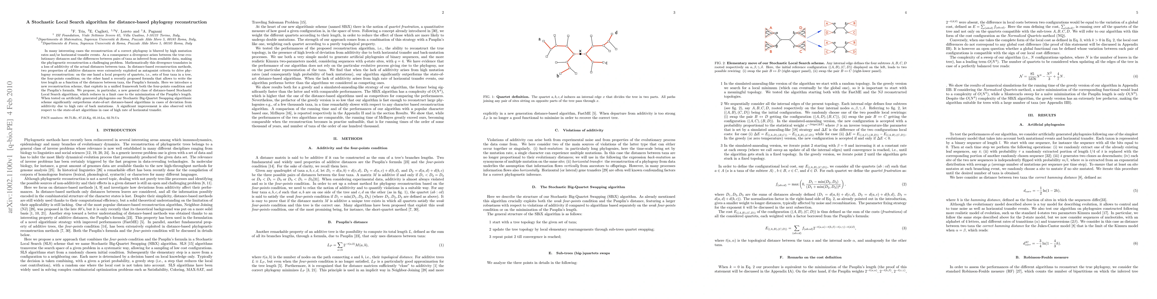 This paper presents a new Stochastic Local Search algorithm, named Stochastic Big-Quartet Swapping, for reconstructing phylogenies despite high mutation rates and horizontal transfers. The method unifies the four-points condition and Pauplin's formula, outperforming existing distance-based algorithms in cases of high back mutations and horizontal gene transfers.