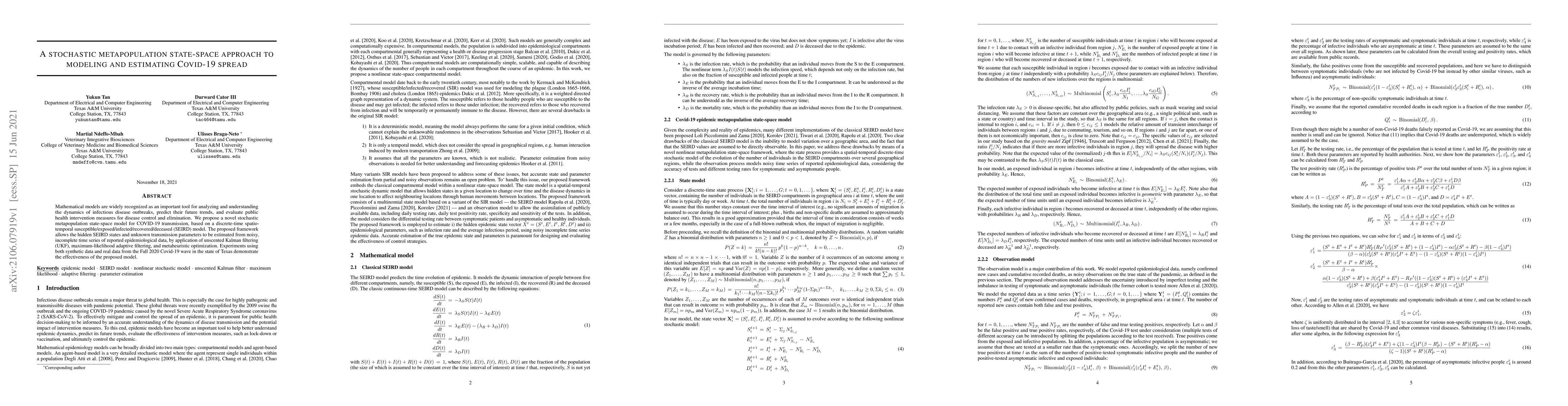 This paper proposes a novel stochastic metapopulation state-space model for COVID-19 transmission based on a SEIRD framework, employing unscented Kalman filtering and optimization techniques to estimate hidden states and parameters from incomplete data. Experiments on synthetic and real data from Texas show the model's effectiveness.